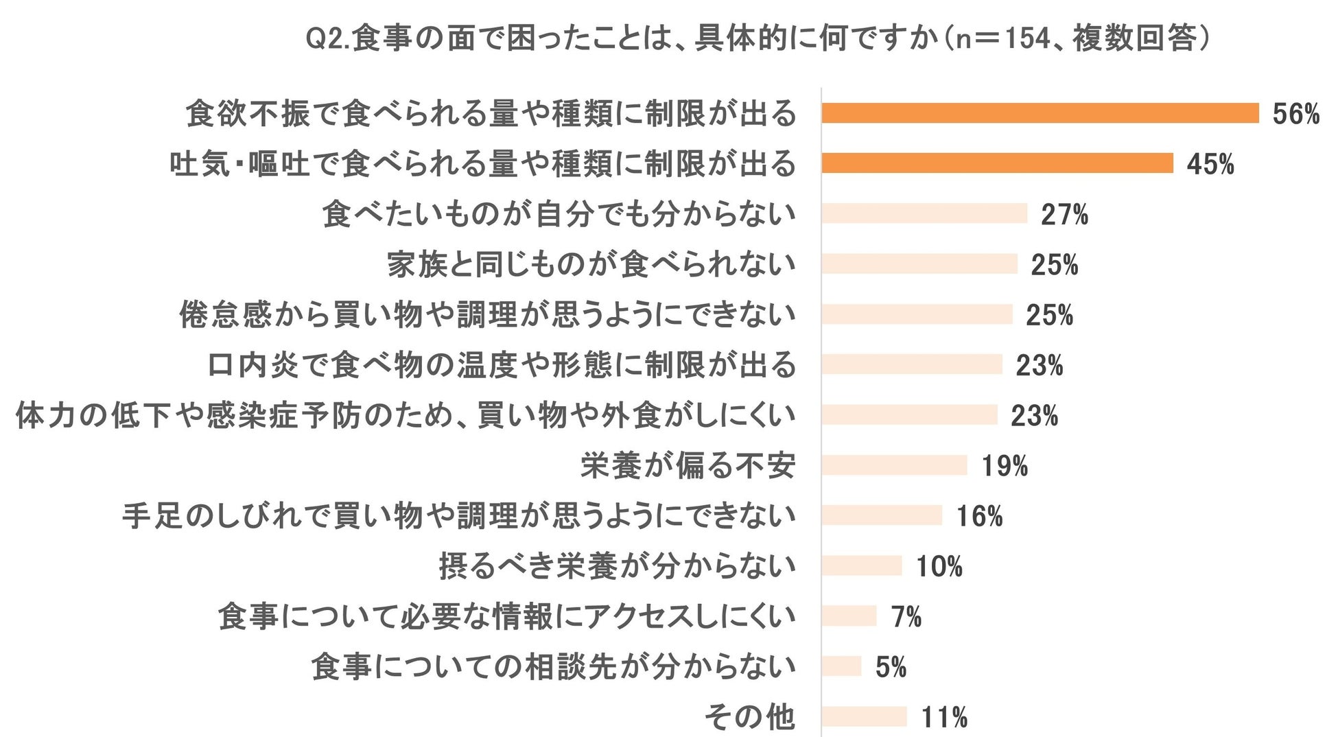抗がん剤治療中の食事や栄養に関して、医療関係者からも「抗がん剤治療を開始する前から栄養状態を意識してほしいが、患者さんもなかなか食事まで意識が向かない」「治療がはじまった後に生じる副作用への一般的な対処方法の案内多くなってしまう」という声が上がるなど、抗がん剤治療を支える食事・栄養状態に関しては情報を提供する側も課題を抱えていることが分かりました。