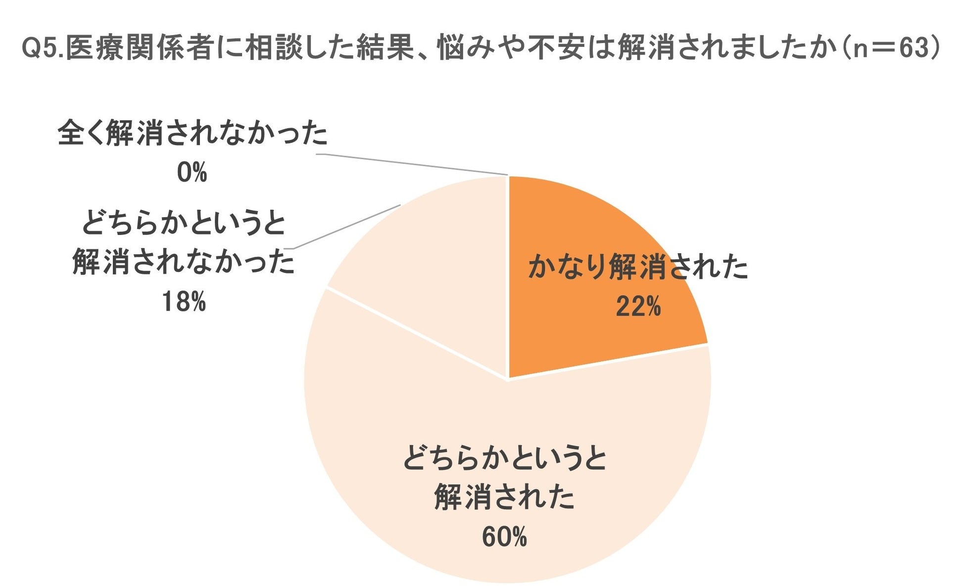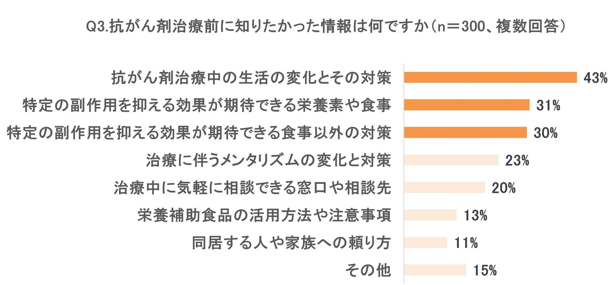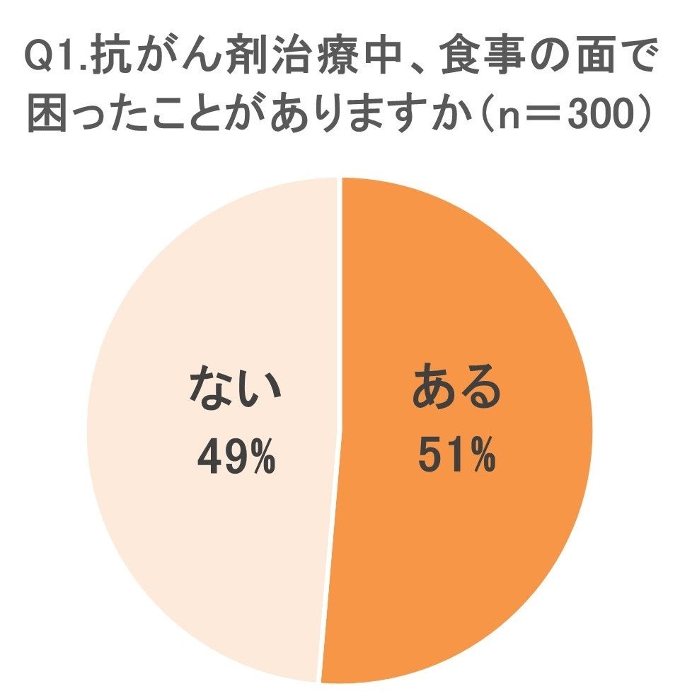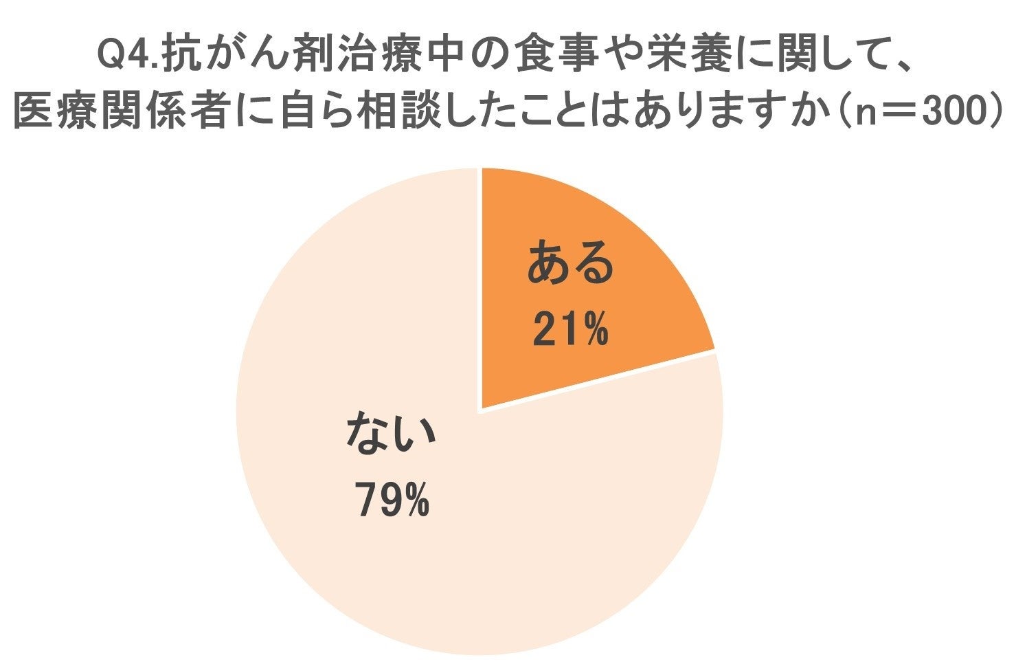 実際に、抗がん剤でのがん治療の経験がある全国の30~60代の男女300名に、がん治療と食事に関する調査を実施したところ、51%が「抗がん剤治療中に食事の面で困ったことがある」と回答し(Q1)、具体的には50%前後が「食欲不振や吐き気・嘔吐で食べられる量や種類に制限が出る」と回答しました(Q2)。抗がん剤治療前に知りたかった情報を聞くと、43%が「抗がん剤治療中の生活の変化とその対策」、約30%が「特定の副作用を押さえる効果が期待できる栄養素や食事、食事以外の対策」と回答しました(Q3)。その一方で、抗がん剤治療中の食事や栄養補給に関して、自ら医療関係者に相談した方は21%しかおらず(Q4)、その中で「悩みや不安がかなり解消した」と回答した方は22%のみでした(Q5)。