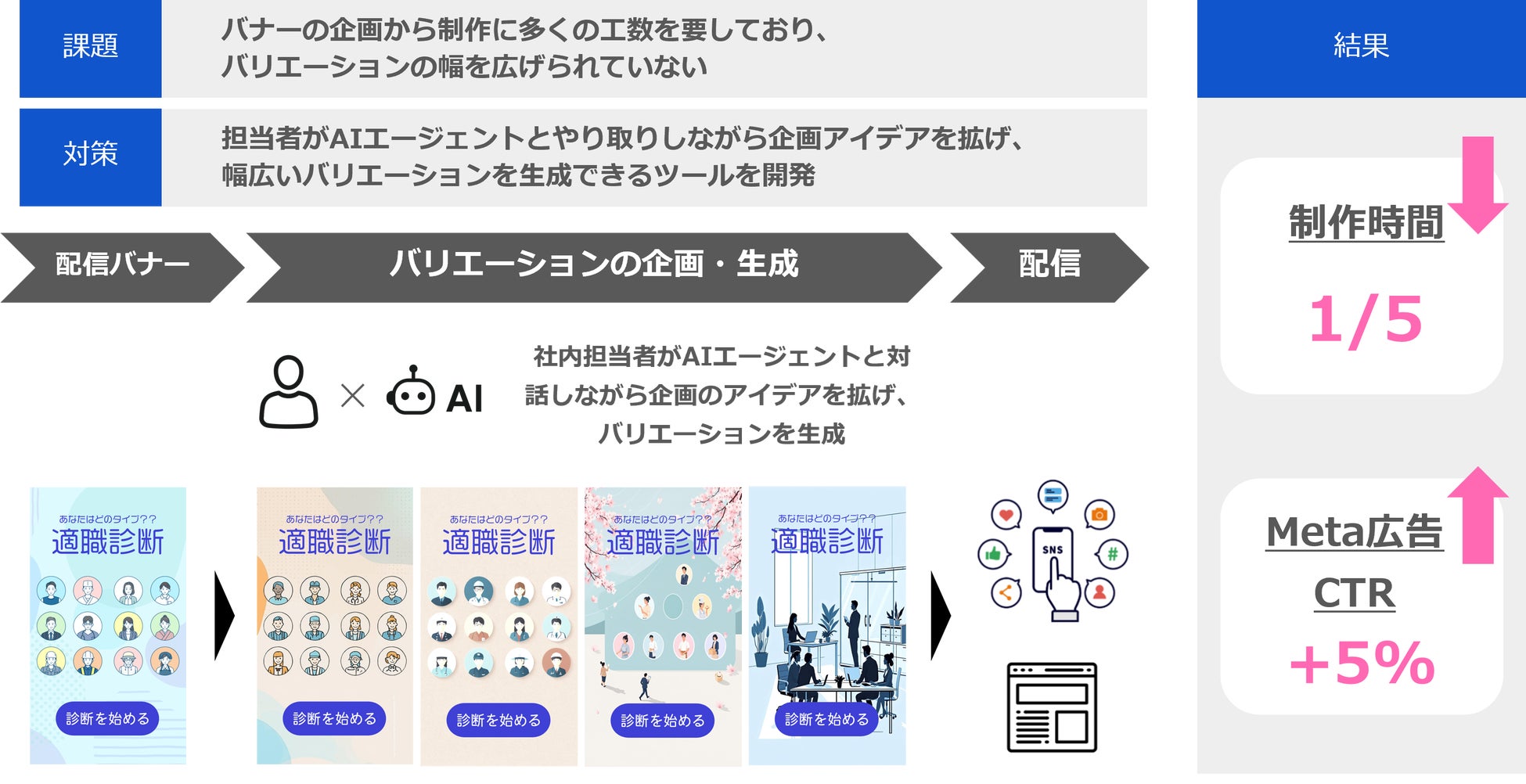 本サービスは、個社単位で独自のAIエージェントを構築するサービスであり、CRAIS+を導入した結果、縦型動画のCPA51%改善、年間数千万円の制作費用削減見込みの事例もございます。