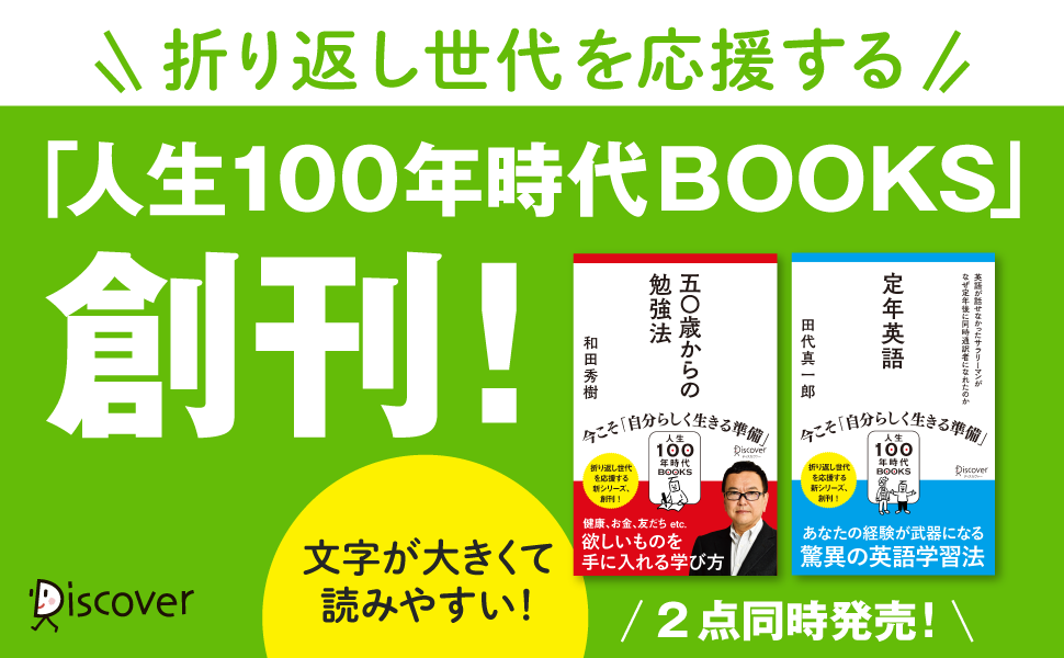株式会社ディスカヴァー・トゥエンティワン(本社:東京都千代田区、取締役社長:谷口奈緒美)は2023年2月17日に新レーベル「人生100年時代BOOKS」を創刊しました。第1弾として『五〇歳からの勉強法』(和田秀樹・著)、『定年英語 英語が話せなかったサラリーマンがなぜ定年後に同時通訳者になれたのか』(田代真一郎・著)の2タイトルを発売しました。