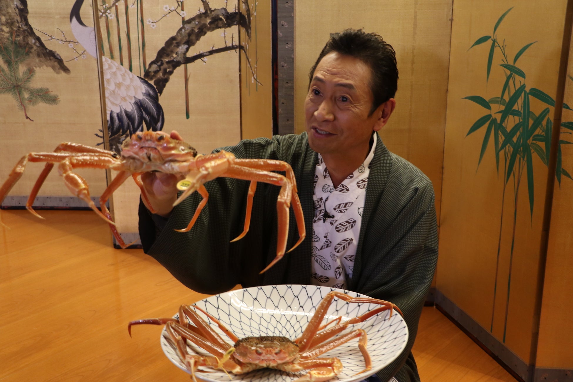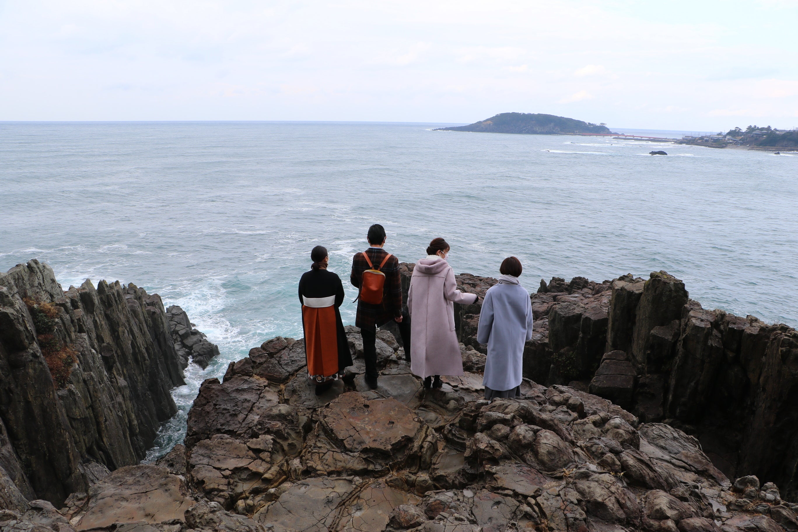 旅の前半は3人娘と福井県の東尋坊からスタート。自然が作りだした、スリル満点の迫力ある断崖絶壁からの絶景を楽しみます。さらに商店街で焼き立ての海の幸やカニの甲羅酒をいただきます。