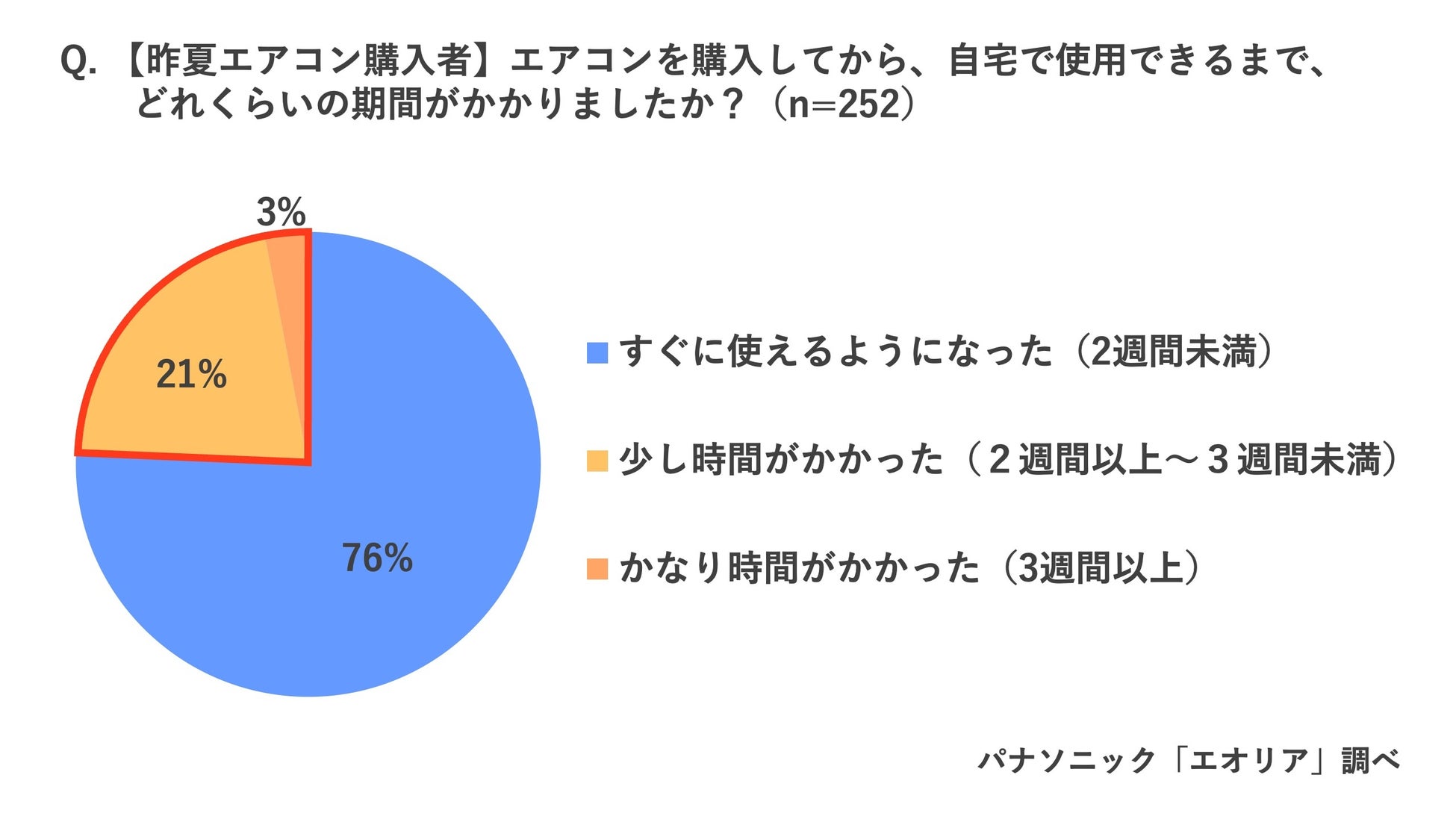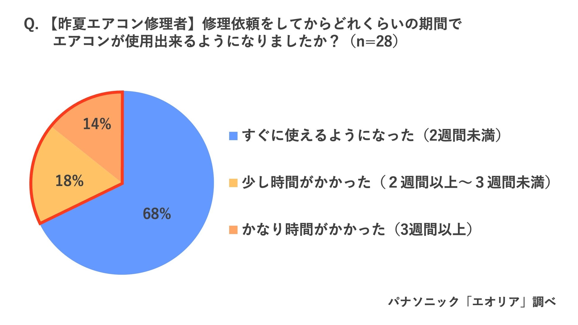 ・昨年夏時期(6~8月)にエアコンを修理した人の3割(32%)、購入した人の2割(24%)が、発注から使用まで2週間以上かかった『エアコン待機者』に