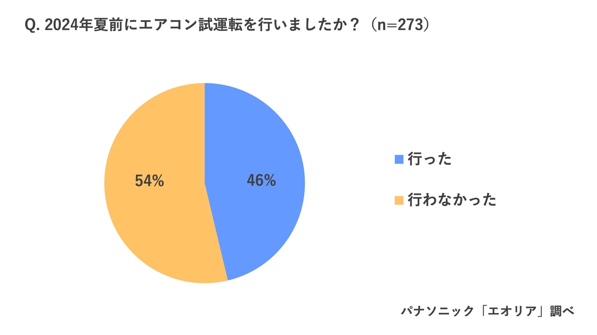 昨夏のエアコン試運転については、46%が行ったものの、54%が行わなかったと回答。
