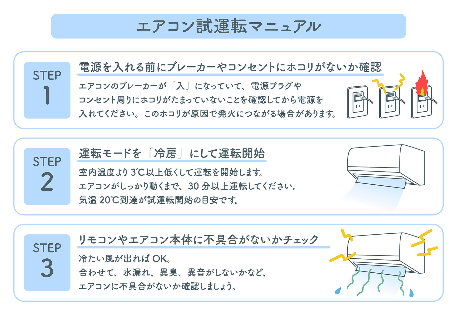 暑さが本格化し、夏の冷房シーズンに入る前には、エアコンを運転し、不具合がないか確認する「試運転」をしておくことが大切です。
