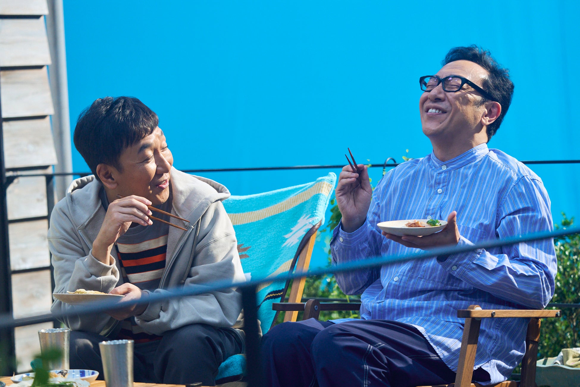豊本さん、麻生さん夫婦の自宅を舞台とした撮影では、カットがかかった後もお米を口に運ぶ手が止まらない東京03の皆さんと麻生さんの4名。思わず「美味い!」とつぶやく場面も。また、撮影日の翌日は豊本さんがお誕生日だったため、撮影終了後にお花とケーキをお渡ししてお祝いしました。現場は笑顔に包まれ、和やかなムードで締めくくられました。
