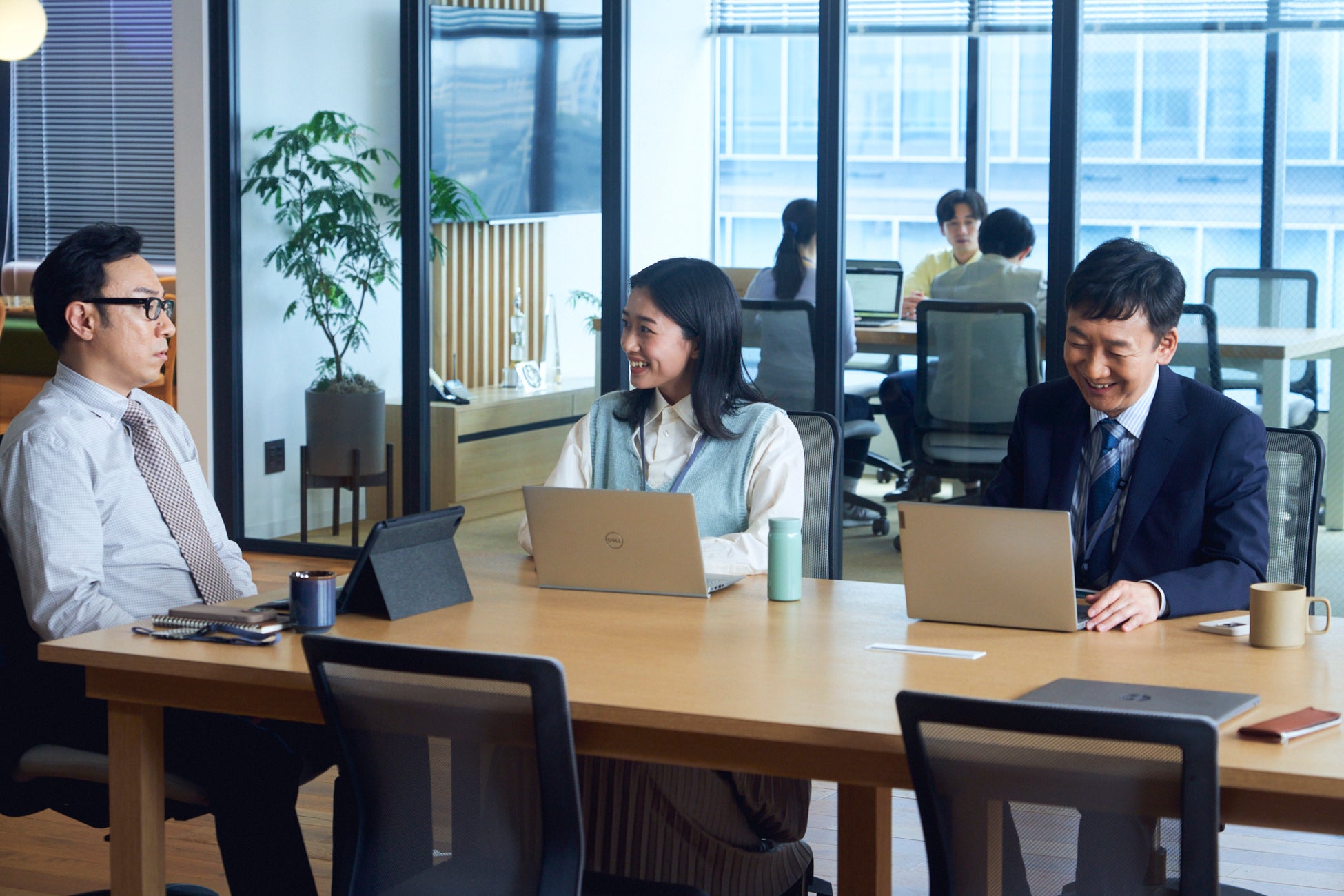 A. 飯塚さん:オフィス撮影は2回目ですよね。河合さんがいて、新たに遠藤さんがいらっしゃって、どんどん変な空間に…。遠藤さんが変な人ですよね、よくわからない!(笑)