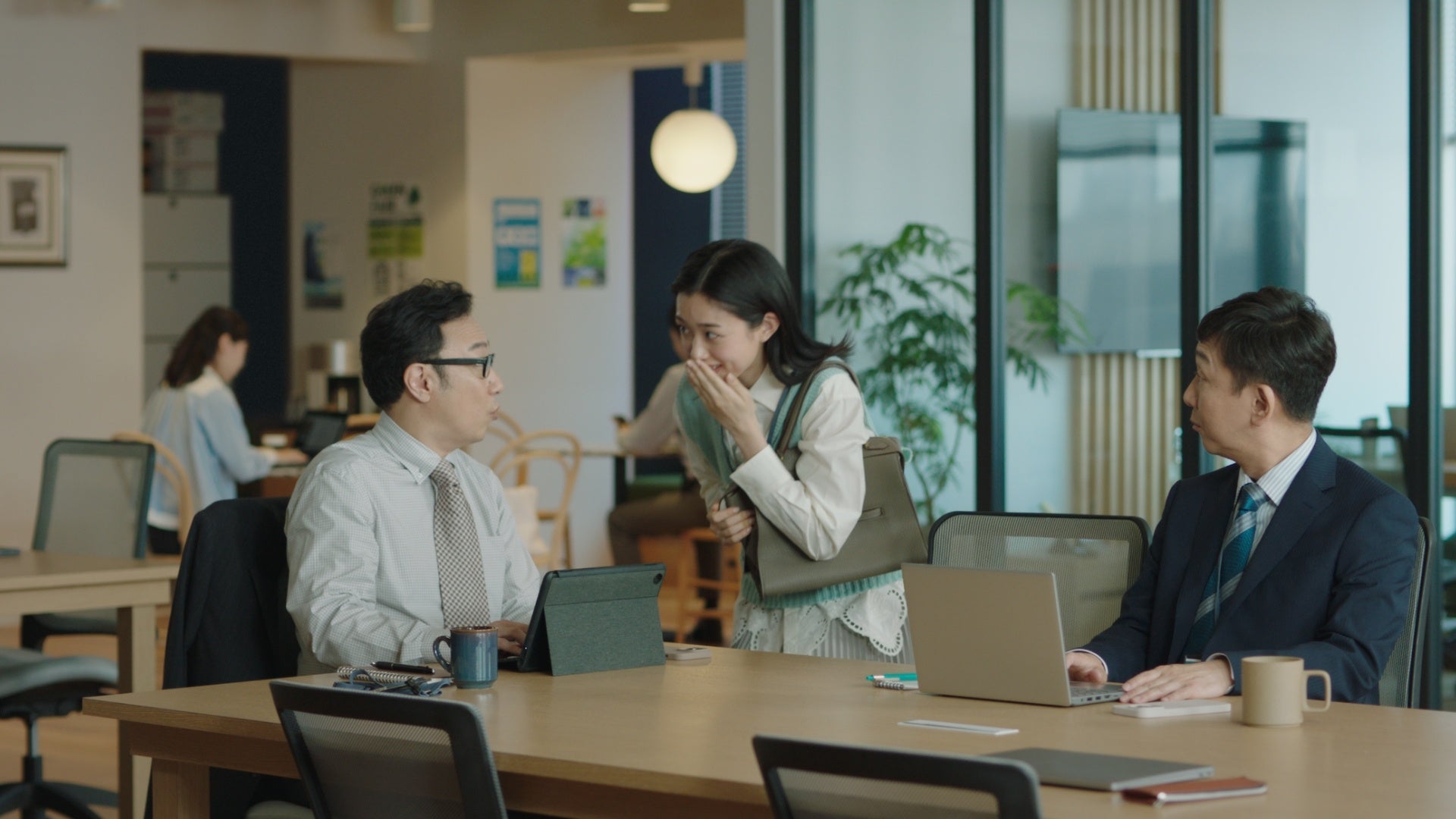 「角田さん、あの…」と少しためらいながら言う河合さんに対して、大事な話だと察して真剣に対応しようと身構える角田さん。耳打ちされた河合さんの言葉に、思わず角田さんの表情がほころびます。そんな2人の様子を飯塚さんが不思議そうに見ていると、角田さんが立ち上がりオフィスにいる人たちに向けて「皆さん!この度、河合さんが“さとふる”始めました!」と声高らかに報告。会社内からあがる拍手や祝福の声に「あ~、そんな大丈夫です…」と恐縮しまくる河合さんでした。