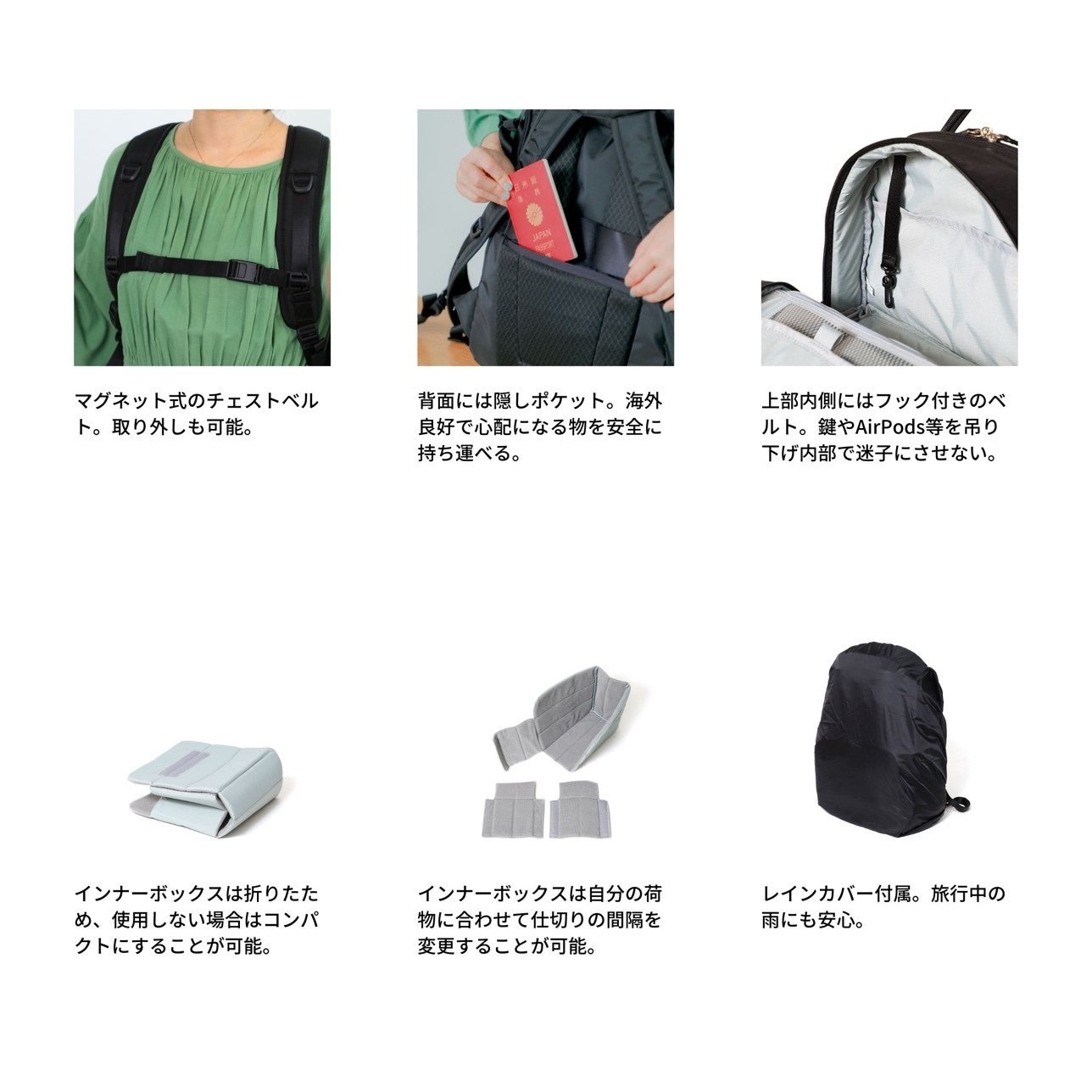 さらに、ふとした瞬間にカメラを取り出せる機能性や、小物の整理に便利な10を超えるポケットなど、女性ならではの視点とアイデアで「鳥のように旅をする」スタイルを実現できるユニークなトラベルリュックです。
