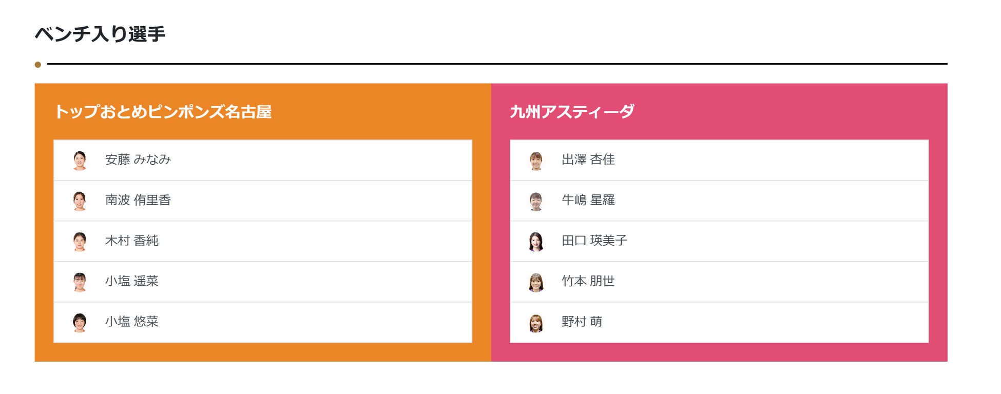 ノジマTリーグ 2023-2024シーズン 公式戦 8月19日 開催 トップおとめピンポンズ名古屋 vs 九州アスティーダ ベンチ入り選手発表