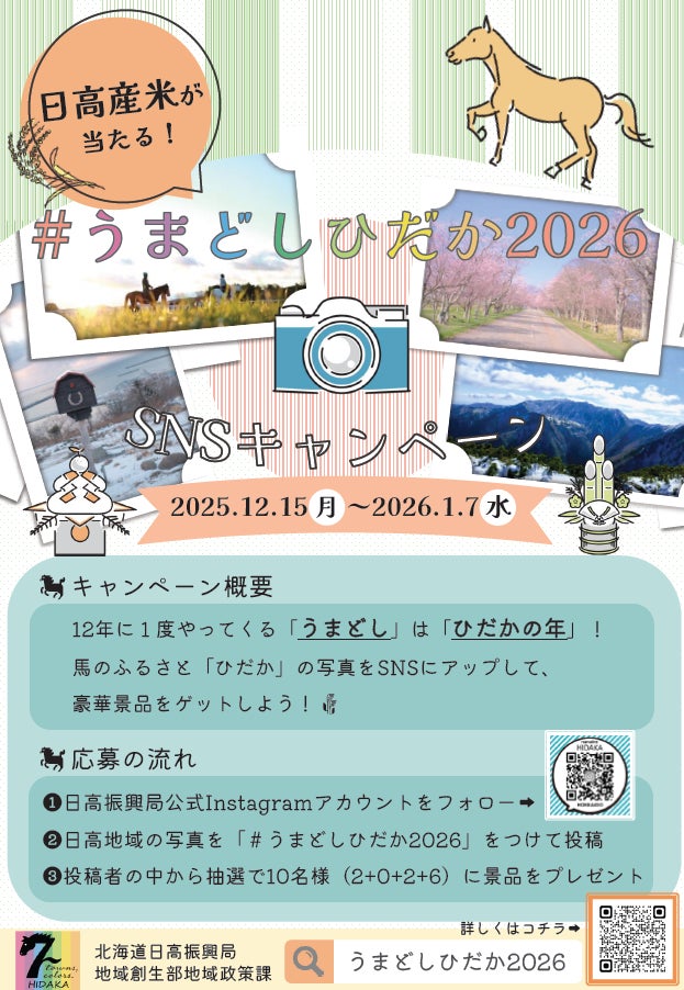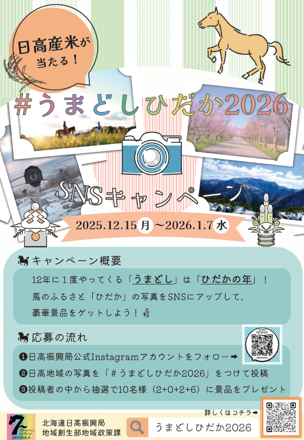 北海道日高振興局では、12年に1度訪れる「うまどし」をきっかけに馬のふるさと「ひだか」の魅力を広くお伝えし、地域を認知し来訪していただくことをめざして「\うまどしひだか2026/キャンペーン」を始めます。まず取組の第一弾として、年末年始の期間中に次のキャンペーンを開催します。