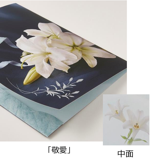 表面に施したマット加工がまるで月の光が優しく降り注いだかのような幻想的な印象を演出し、水色のリボンと流線形のカットに添えた銀箔の百合が静かに故人を偲ぶ敬愛の意をお伝えします。