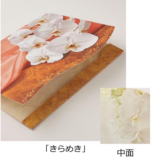美しくカットされた流線から覗く金色のグラデーションとのコントラストが美しく、華やかに散りばめられた箔押しが台紙を開くたびに上品に煌めくデザインで、「人事」、「叙勲」、「開店祝い」といったビジネスシーンでのお祝いを彩ります。