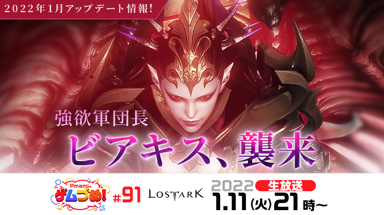株式会社ゲームオン[本社:東京都渋谷区、代表取締役社長:李 相燁(イ サンヨプ)]は“すべての人に捧げるオンラインRPG”『LOST ARK』(以下『ロストアーク』)において、2022年1月11日(火)21時から、ゲームオン生放送番組「Pmangのゲムづめ!」で、最新アップデート「軍団長レイド:ビアキス」に関する内容を配信いたします。