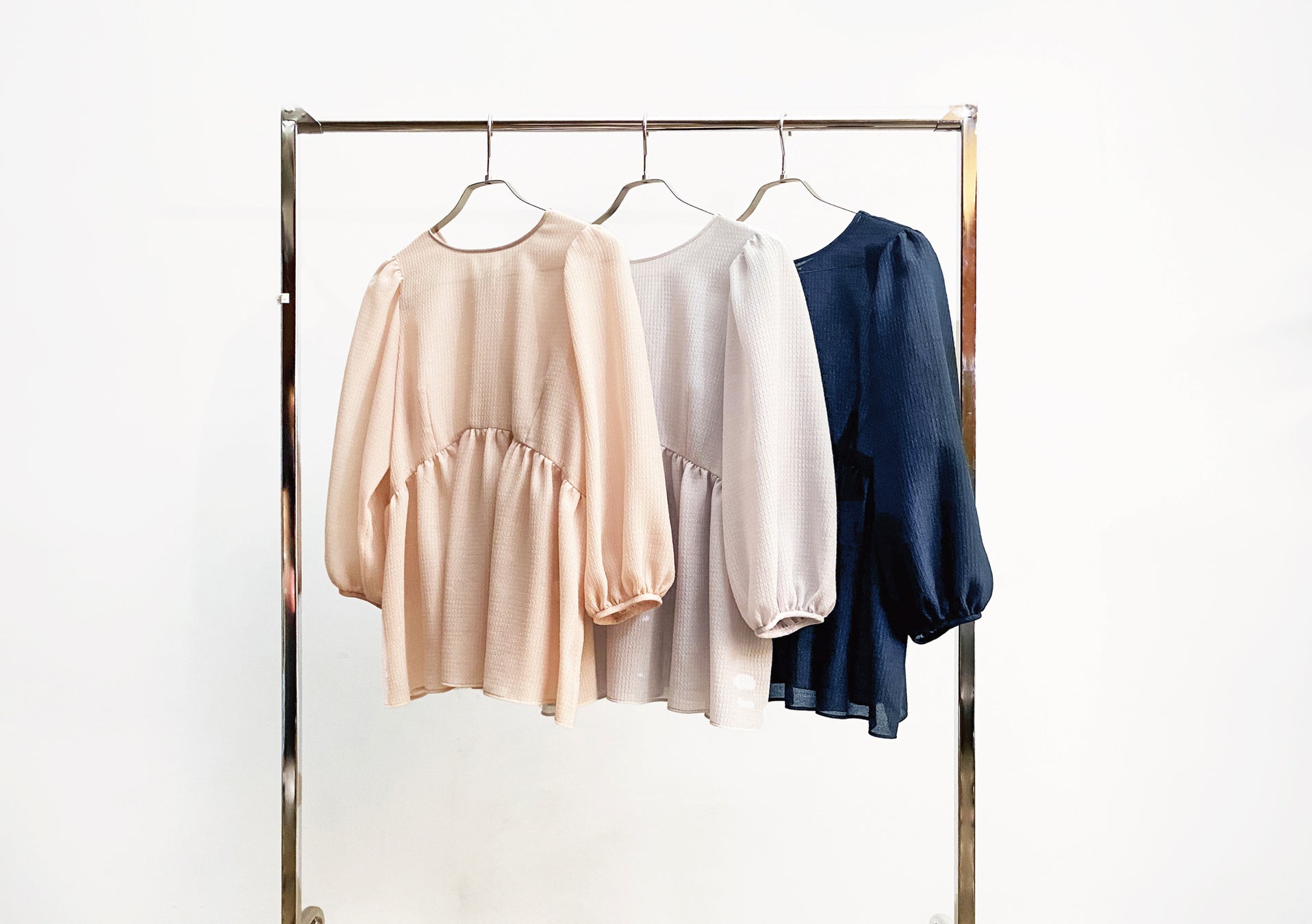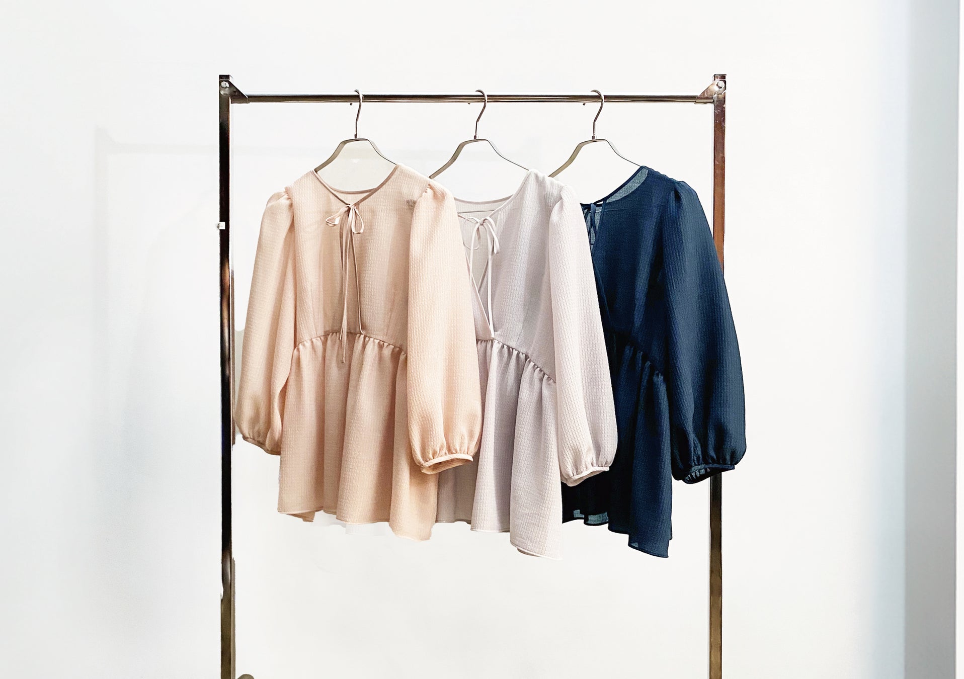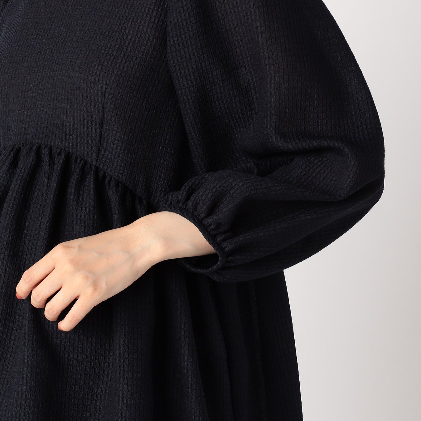 ・立体感のあるパフスリーブや、光沢感のあるサテンパイピングを襟ぐりに使用することで、大人の甘さをプラスしました。
