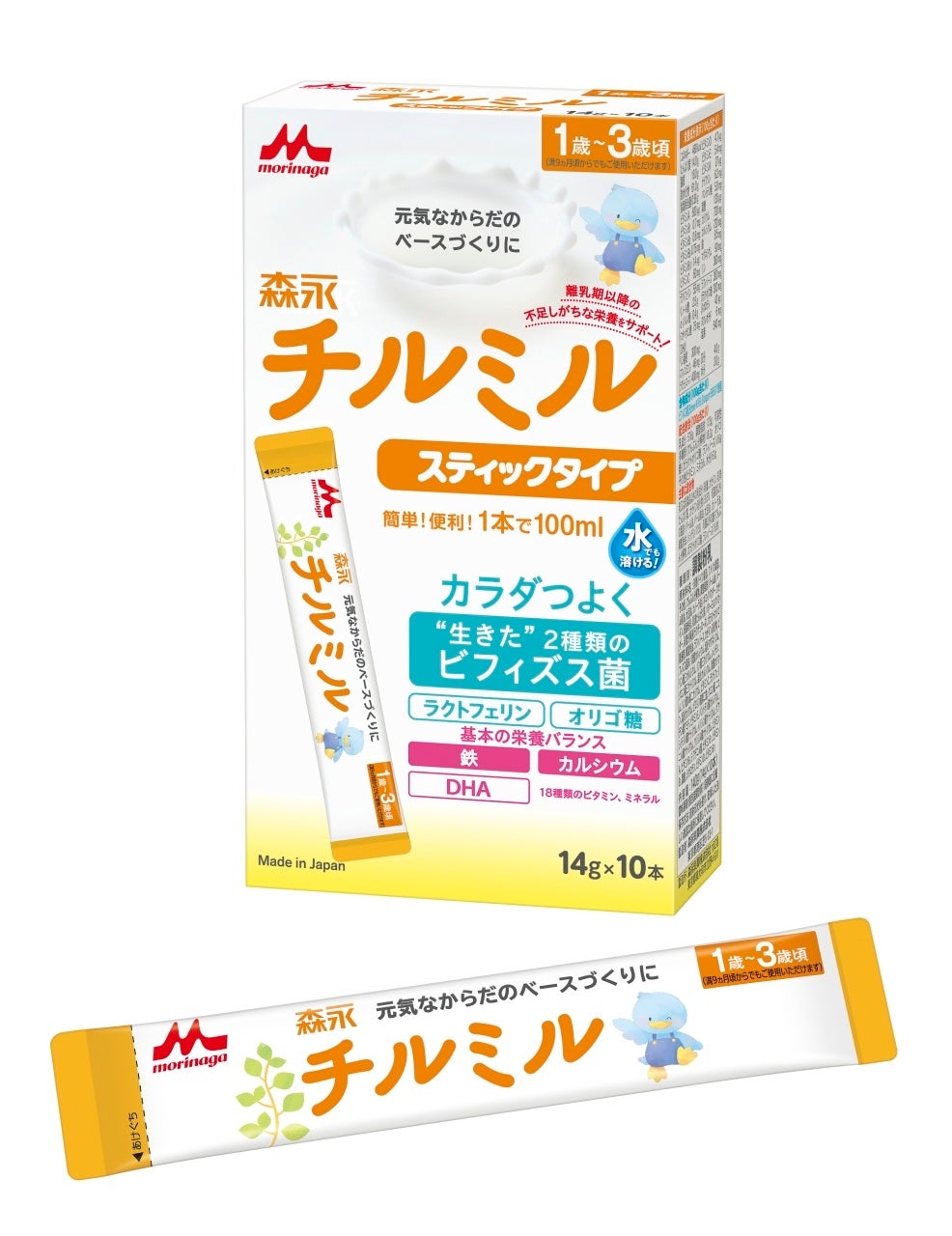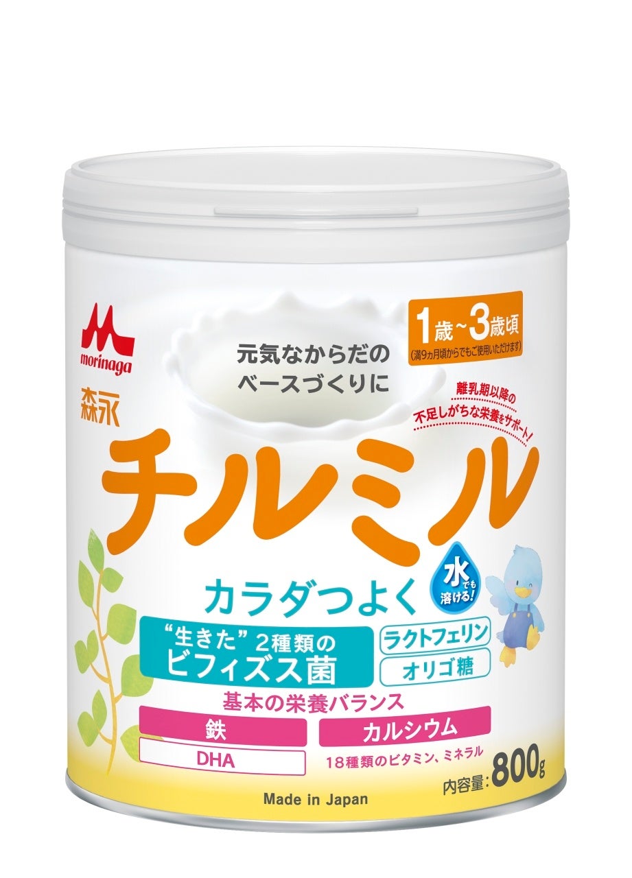 「森永チルミル」では、発達に大事なDHA、食事では不足しがちな鉄・カルシウムなど、1歳から3歳頃までの幼児期に必要な栄養素をバランスよく補給でき、お子さまを守るラクトフェリン、3種類のオリゴ糖などを配合しています。また、フォローアップミルクとして日本初※2のビフィズス菌を配合した育児用ミルクであり、2 種類の“生きた”ビフィズス菌(「M-16V・BB536」を配合しています。いずれも「ヒトにすむタイプのビフィズス菌」で、「ビフィズス菌 M-16V」は乳幼児期に多いビフィズス菌、「ビフィズス菌 BB536」は、乳児から大人まで幅広い世代に多いビフィズス菌です。離乳期から幼児期にかけては腸内細菌叢が大きく変化しますが、この時期の腸内環境に適したビフィズス菌を配合することで、お子さまの元気なからだづくりをさらにサポートします。