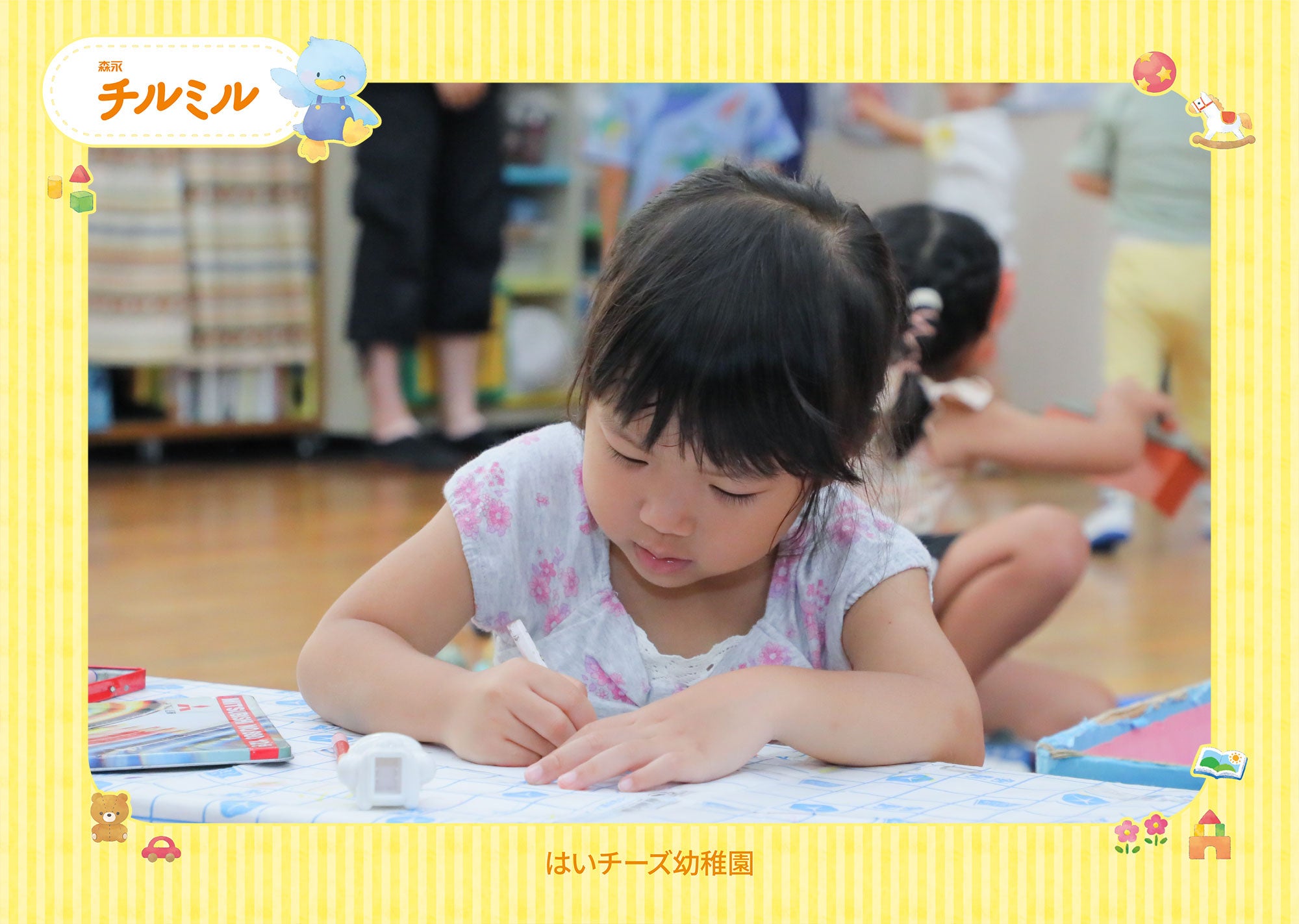 楽しく学んでいるお子さまの様子をプロのカメラマンが撮影します。お子さまの楽しい思い出の記録を残します。撮影した写真は「森永チルミル」をモチーフにした特別なフレーム付きで購入いただけます。