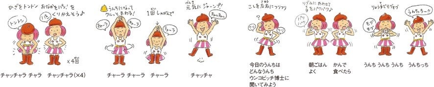 日本トイレ研究所が作成した「うんちっち体操」は、お子さまの便秘対策のヒントになる姿勢や動きをたくさん取り入れて、親子で楽しく踊れる体操です。各保育園・幼稚園に「うんちっち!のうた」のCDを配布し、日常のプログラムで取り入れていただくと同時に、保護者にも覚えていただくことで、ご家庭でも取り入れていただくよう促進いたします。