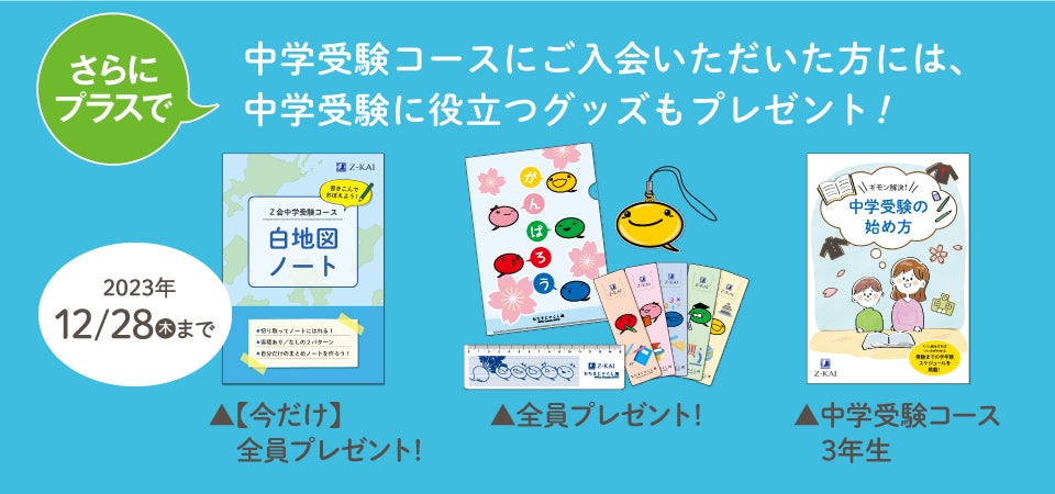 【新小2:2024年1月30日、新小3~6:2023年12月28日】までのご入会で、以下の豪華特典をプレゼントいたします。