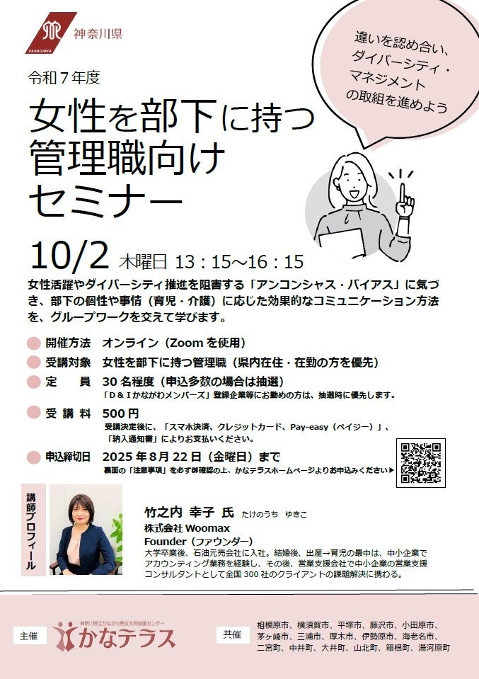 かなテラスでは、女性活躍推進等を阻害する「アンコンシャス・バイアス」に気づき、部下の個性や事情(育児・介護)に応じた効果的なコミュニケーション方法を、グループワークを交えて学べるセミナーを開催します。