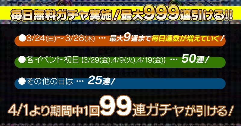 3月24日(日)~4月29日(月)までの間、毎日無料で引けるガチャを実施中です。