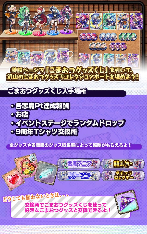 特設ページにて、イベント中の報酬などで入手できる「ごまおつグッズくじ(悪魔)」を使うと、ランダムで悪魔のコレクションアイテムを獲得することができます。