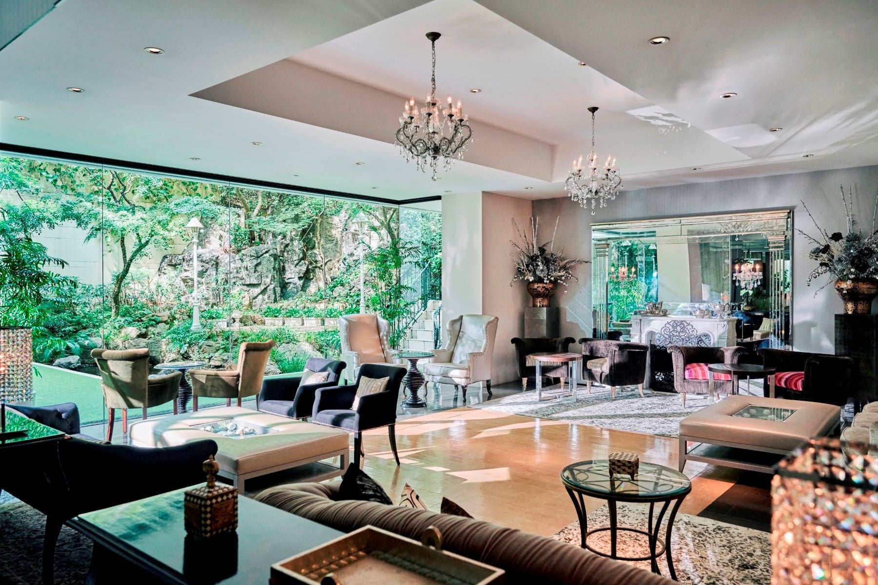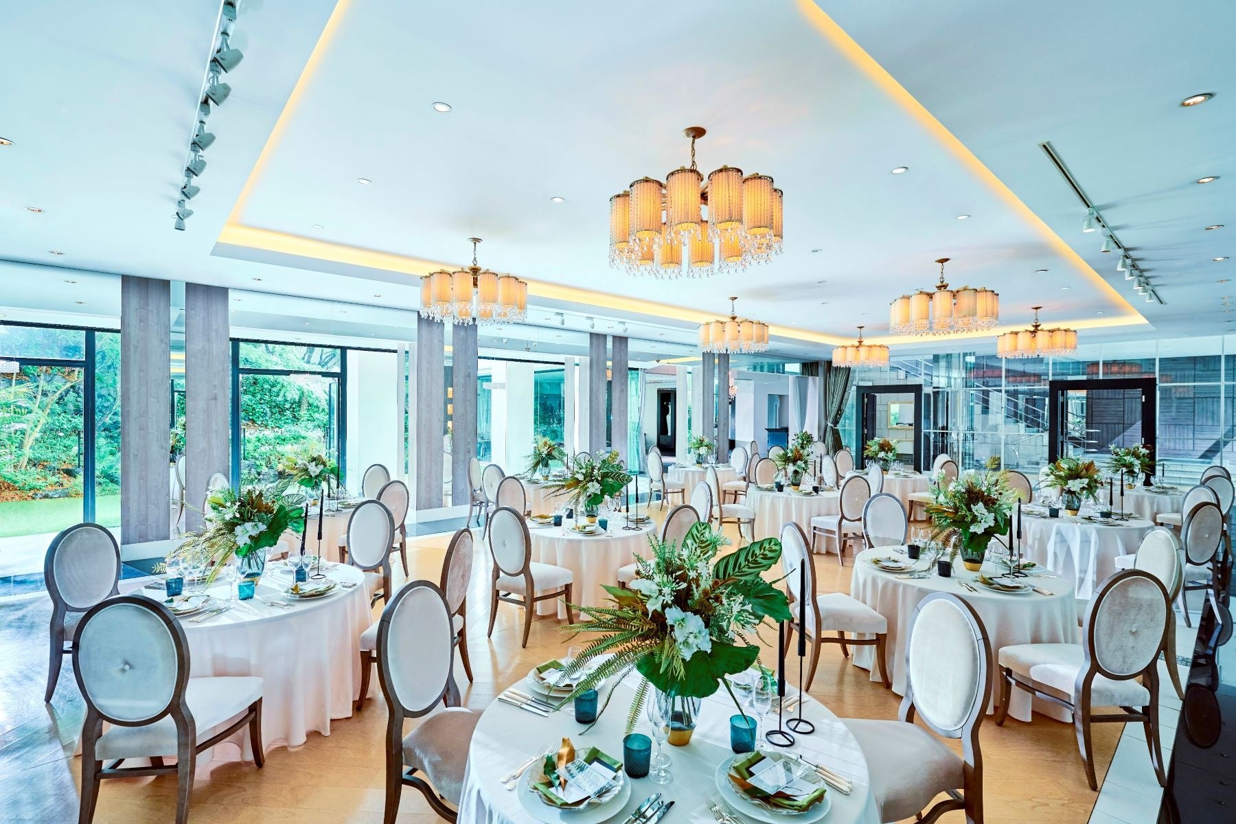 大階段を下りた先に広がるのは、明るく開放的なパーティフロア。リビング、バンケット、ガーデンがパノラマで臨める圧巻の広さです。都会の喧騒を忘れさせてくれる、贅沢な一日をお過ごしいただけます。