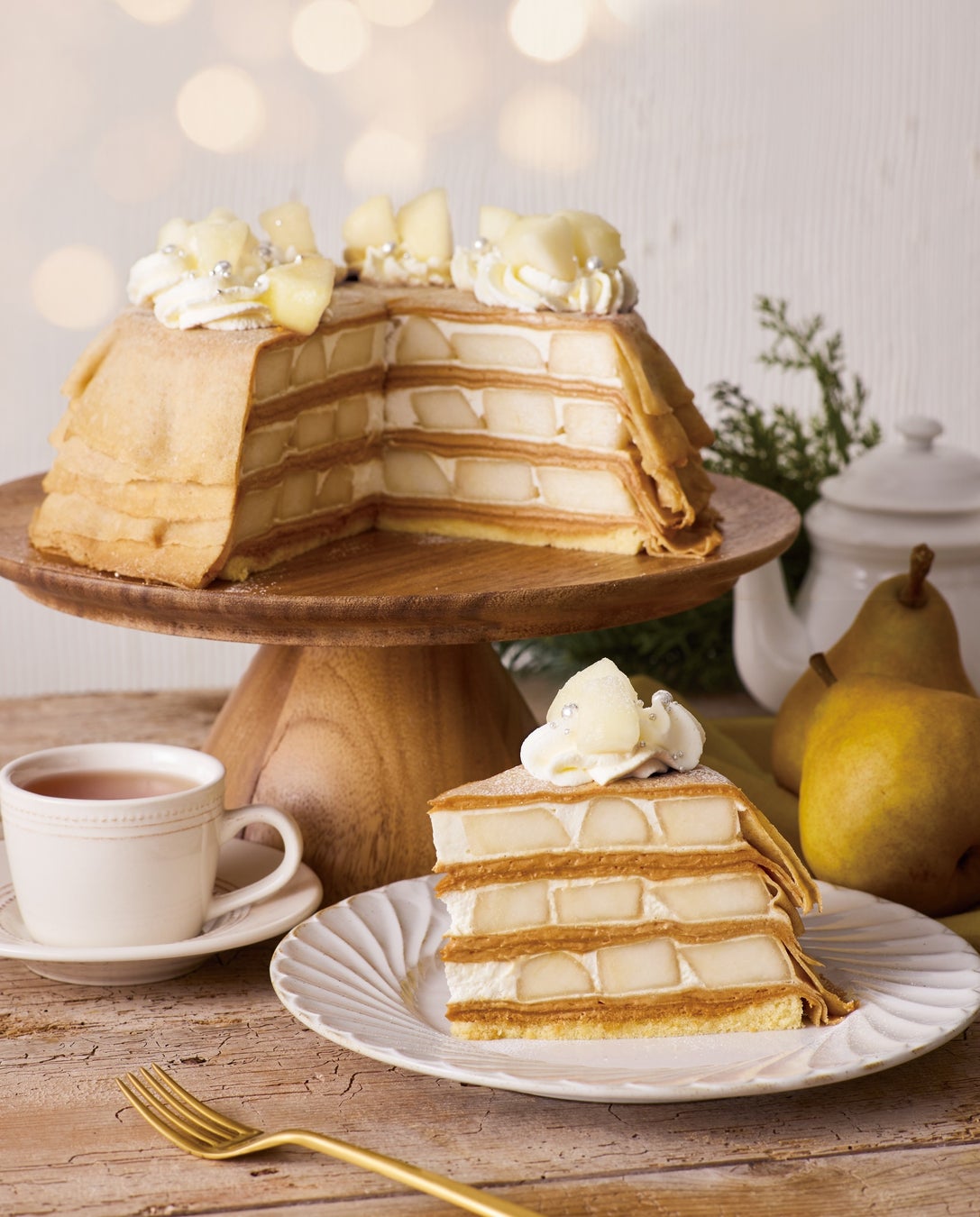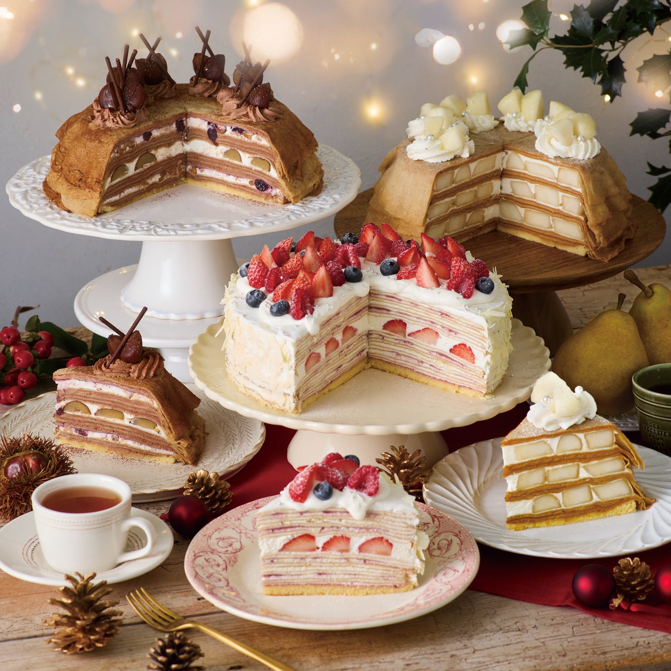 さらに、今年のクリスマスシーズンは、季節を感じる2つの味わいが仲間入り。旬のラ・フランスを使用した「ラ・フランスと自家製キャラメルクリームのミルクレープ」は、みずみずしい果肉と、とろけるような食感がお楽しみいただけるクリスマスシーズン前半の新作です。後半を彩るもうひとつの新作「マロンとチョコレートクリームのミルクレープ」は、栗とチョコレートの組み合わせにカシスの酸味とクルミをアクセントに加えました。