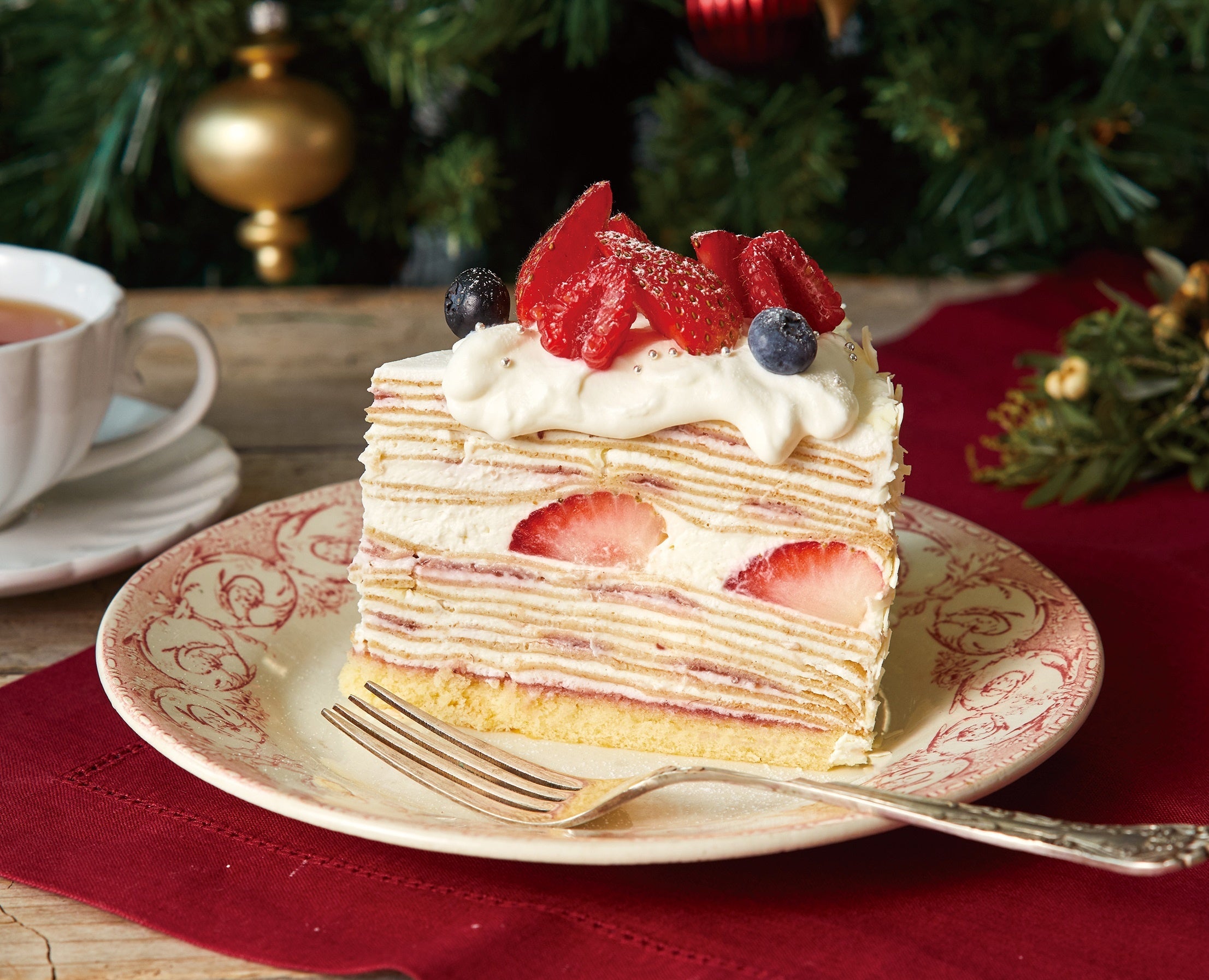こだわりのクレープ生地とマスカルポーネ入りのホイップクリームにフランボワーズジャムを重ねました。苺とブルーベリー、ラズベリーをあしらったクリスマス限定ミルクレープ。