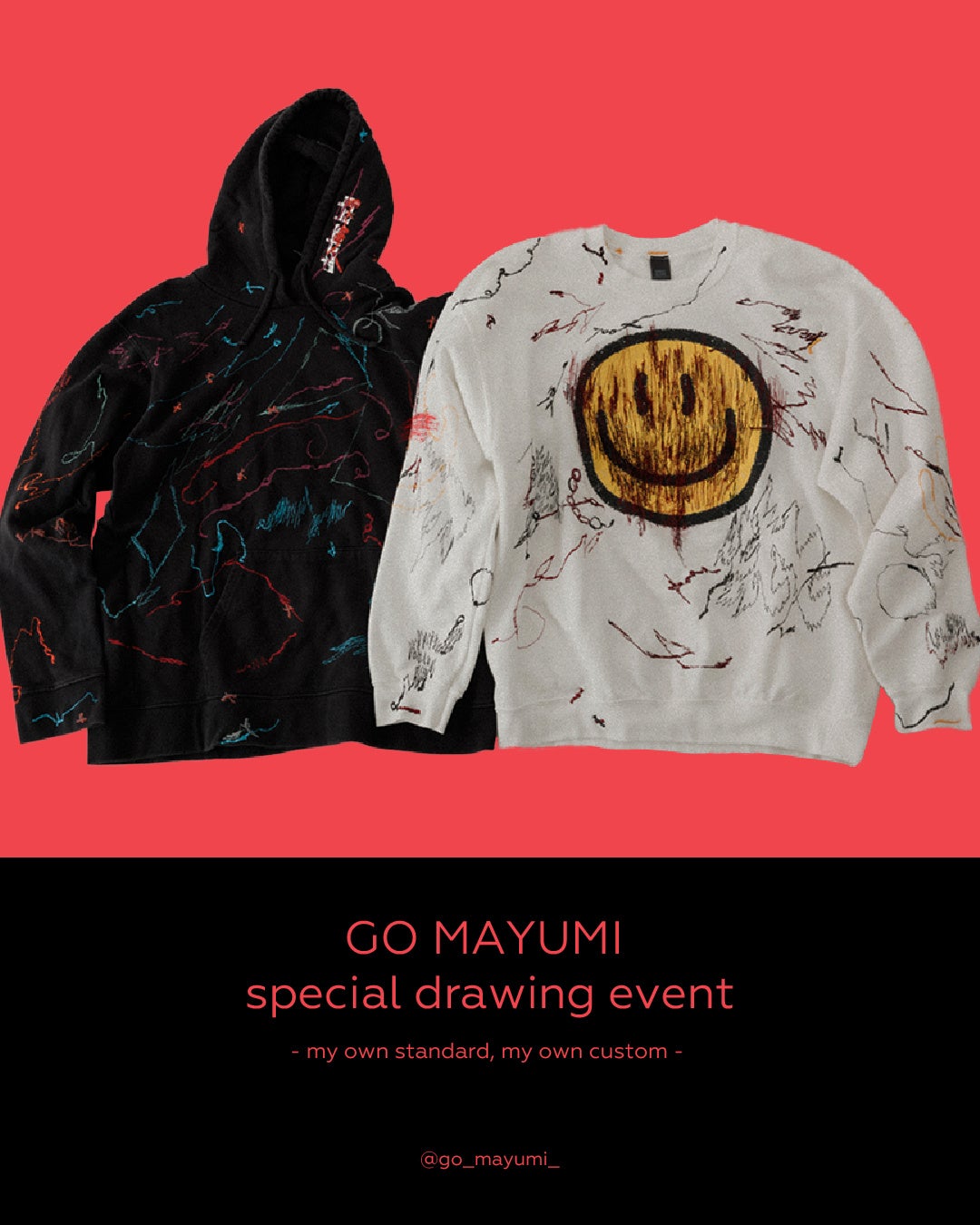 「GO MAYUMI」とコラボレーションし、当日お買い上げいただいた商品にその場でミシンドローイングを施します。(持ち込み対応も可:持ち込み費有)