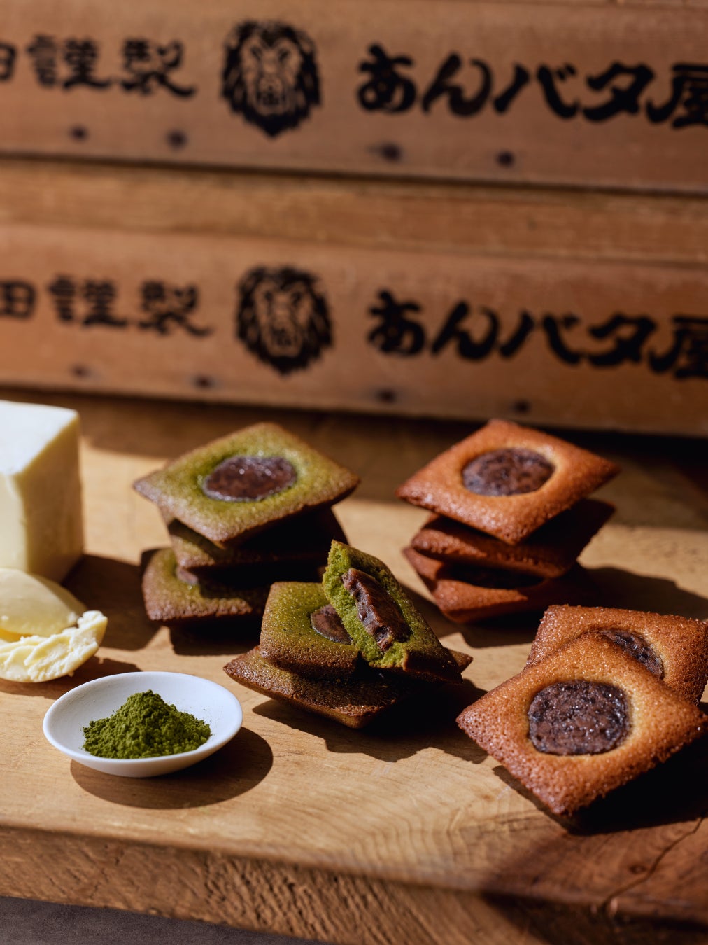 碾茶を忍ばせより薫りの立った抹茶と、丁寧に焦がしたバターが染み入ったフィナンシェ生地で、北海道千歳産『えりも小豆』餡子を包み込んだ。