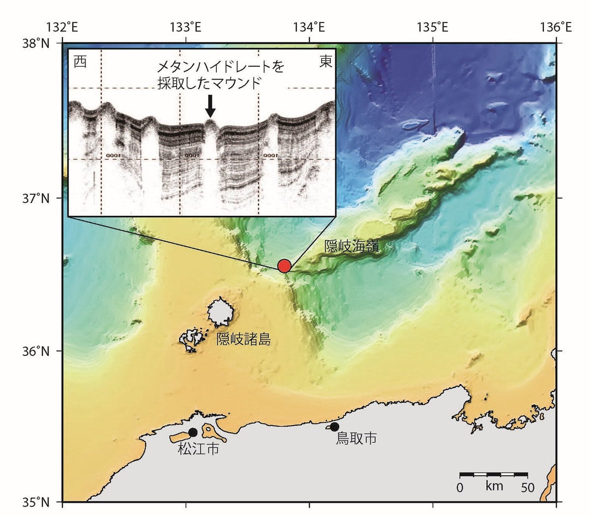 2004年頃より東京大学、明治大学、千葉大学、海洋研究開発機構、産総研等による共同学術調査によって、日本列島沿いの日本海の海底には、海底下深部で生成した天然ガスの移動・逸脱構造としてのガスチムニーや、ガス逸脱に伴う特異地形、マウンド、ポックマークが広く分布していることが明らかになっています(参考文献1)。また、新潟県や秋田県の沖合では、今回と同様の塊状メタンハイドレートが採取されています(参考文献2)。これら特異地形や構造が密集している隠岐諸島沖(隠岐海嶺)では採泥調査が進んでおらず、塊状ハイドレートは採取されていませんでした。今回の発見を契機にハイドレート分布調査が進めば、日本海のメタンハイドレートの分布範囲が拡大し、資源量も増大すると考えられます。