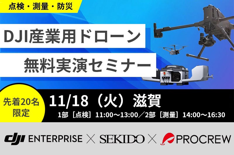 DJI(ディージェイアイ)正規販売代理店としてドローンビジネスの最先端を支える株式会社セキド(本社:東京都港区、代表取締役:大下貴之)は、株式会社プロクルー(本社:滋賀県長浜市、代表取締役:酒井正裕)と共催で、2025年11月18日(火)に滋賀県米原市で「産業用ドローン 点検/防災/ICT施工/測量 無料実演セミナー」を開催いたします。
