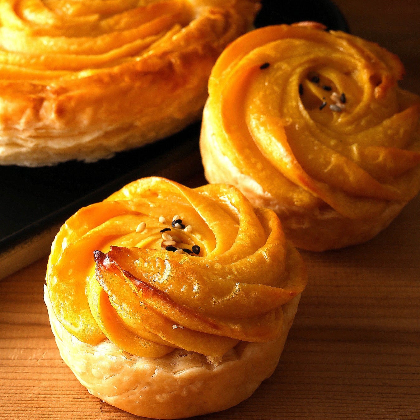 鹿児島県種子島産安納芋のホクホク感と甘みをとじこめたクリームをバターが香るサクサクのパイにのせて焼き上げました。