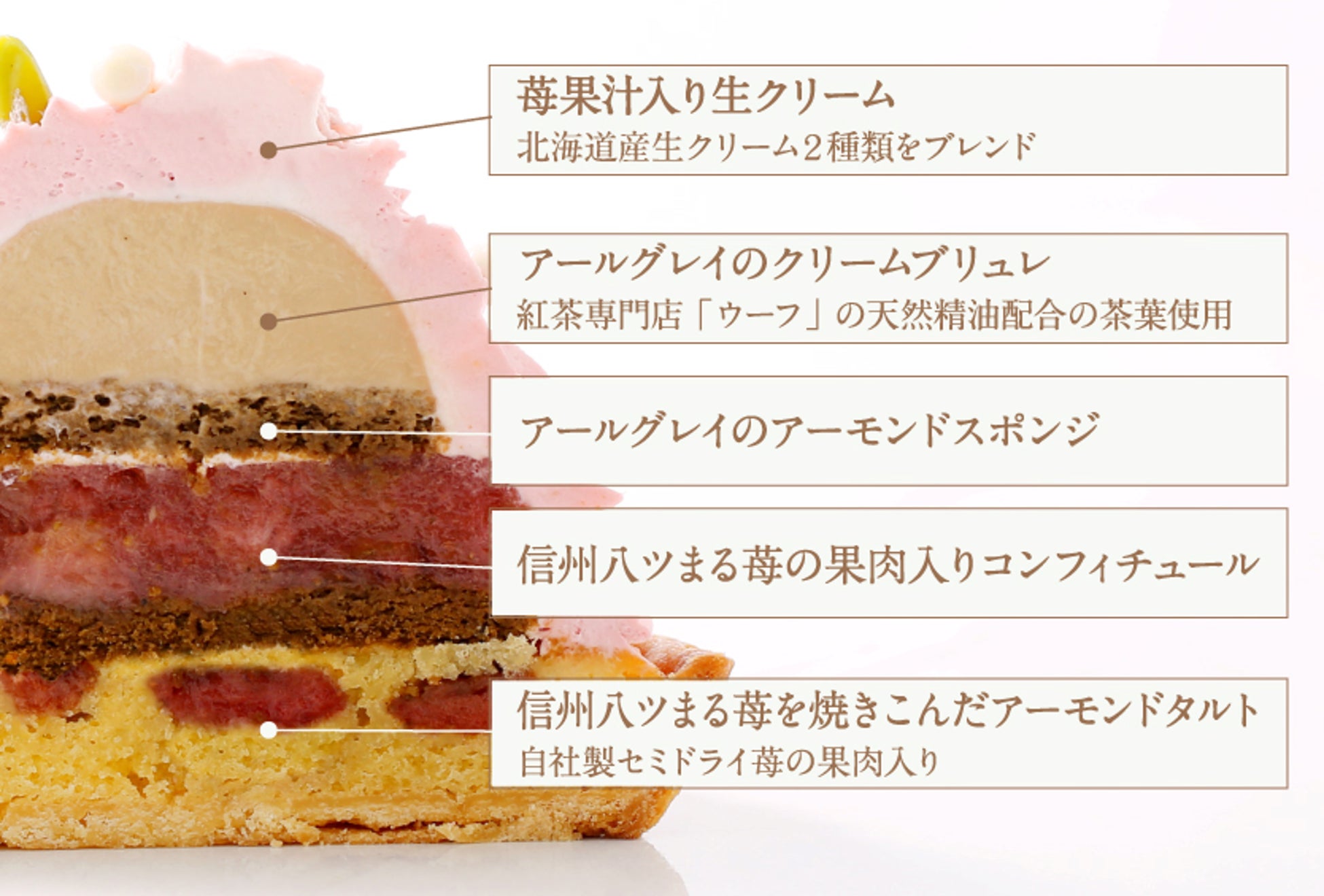 長野県八ヶ岳エナジーファームから直送の「八ツまる苺」の果肉を焼き込んだタルトに苺のコンフィチュール、アールグレイのクリームブリュレを重ね、苺果汁入りのクリームをブーケのようにしぼりました。