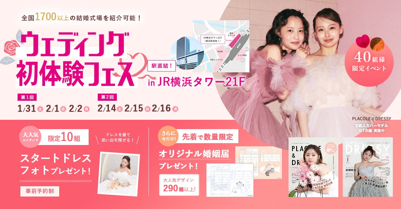 「PLACOLE & DRESSY」ブランドを展開する冒険社プラコレ(本社:神奈川県鎌倉市、代表取締役CEO:武藤功樹)は、横浜駅直結JR横浜タワー21F、ウェディングの魔法にかかる空間"DRESSY ROOM YOKOHAMA"にて、1/31(土)~2/2(月)の3日間限定で、これから結婚式をお考えのカップル様に向けた、個室相談やウェディングドレス試着ができる豪華特典付きのウェディング初体験フェスを開催いたします。(40組様限定、無料開催)