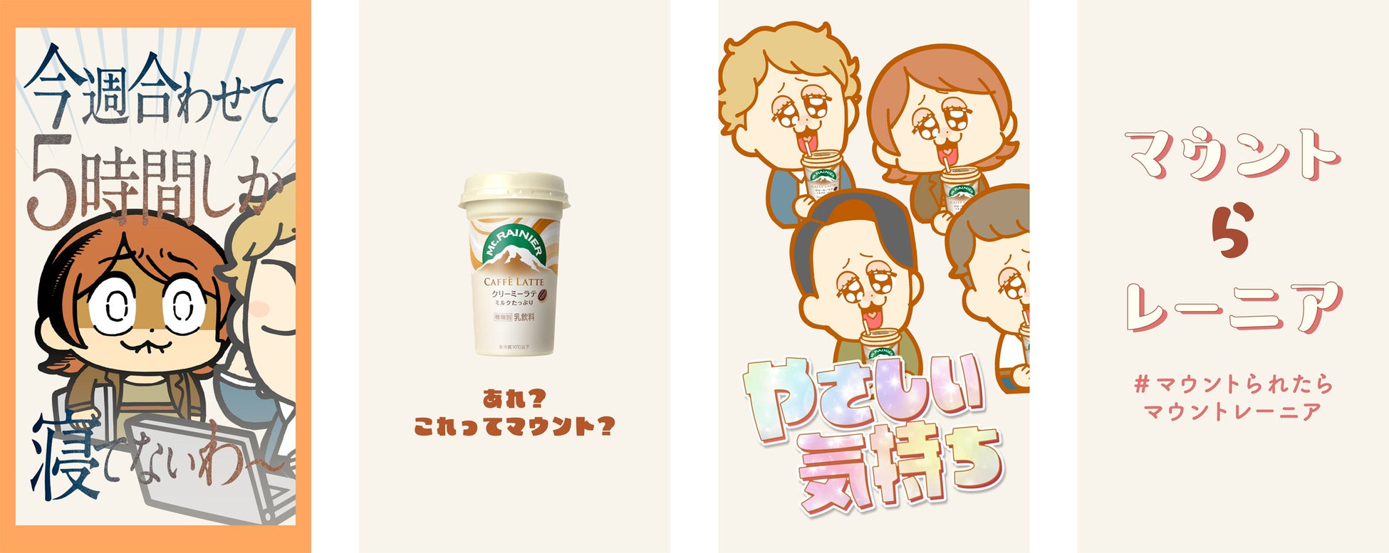 「今週合わせて5時間しか寝てないわ~」「いいなぁ、独身は自由で」「メイクうまくてうらやましい!私いつもすっぴんだから」など、世の中では「あれ?もしかして“マウント”とられてる?」とつい感じてしまうシーンに遭遇することも珍しくありません。本Web動画では日常生活に潜んでいるこうした“マウント”を、個性派漫画家として知られる大川ぶくぶさんのイラスト、そしてYouTube動画総再生回数20億回超えのマルチエンターテイナー・P丸様。のリズミカルな歌で紹介し、“マウント”をとられてモヤモヤしている気持ちが「マウントレーニア カフェラッテ クリーミーラテ」のまろやかな甘さで癒やされていく様子を表現しています。視聴するたび目と耳に残り思わずクセになるユニークな動画にご注目ください。