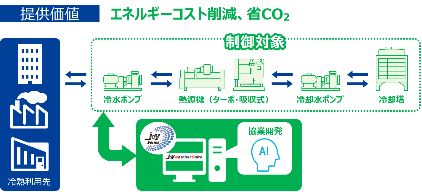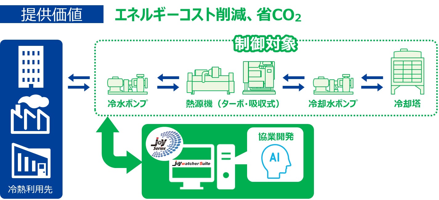 今回3社は、ビル・工場等の空調熱源の更なる省エネ運転の実現を目指し、機器の稼働を最適化するAIの開発を目指します。東京ガスが展開するJoyWatcherSuite(国内販売数1位[*3]のSCADAソフトウェア[*4])や研究開発で先行実証した熱源機器のAI制御の知見を組み合わせることで、よりリーズナブルな価格で汎用性あるAIを実現し、中小企業のお客さまへも広く価値をお届けしていきます。