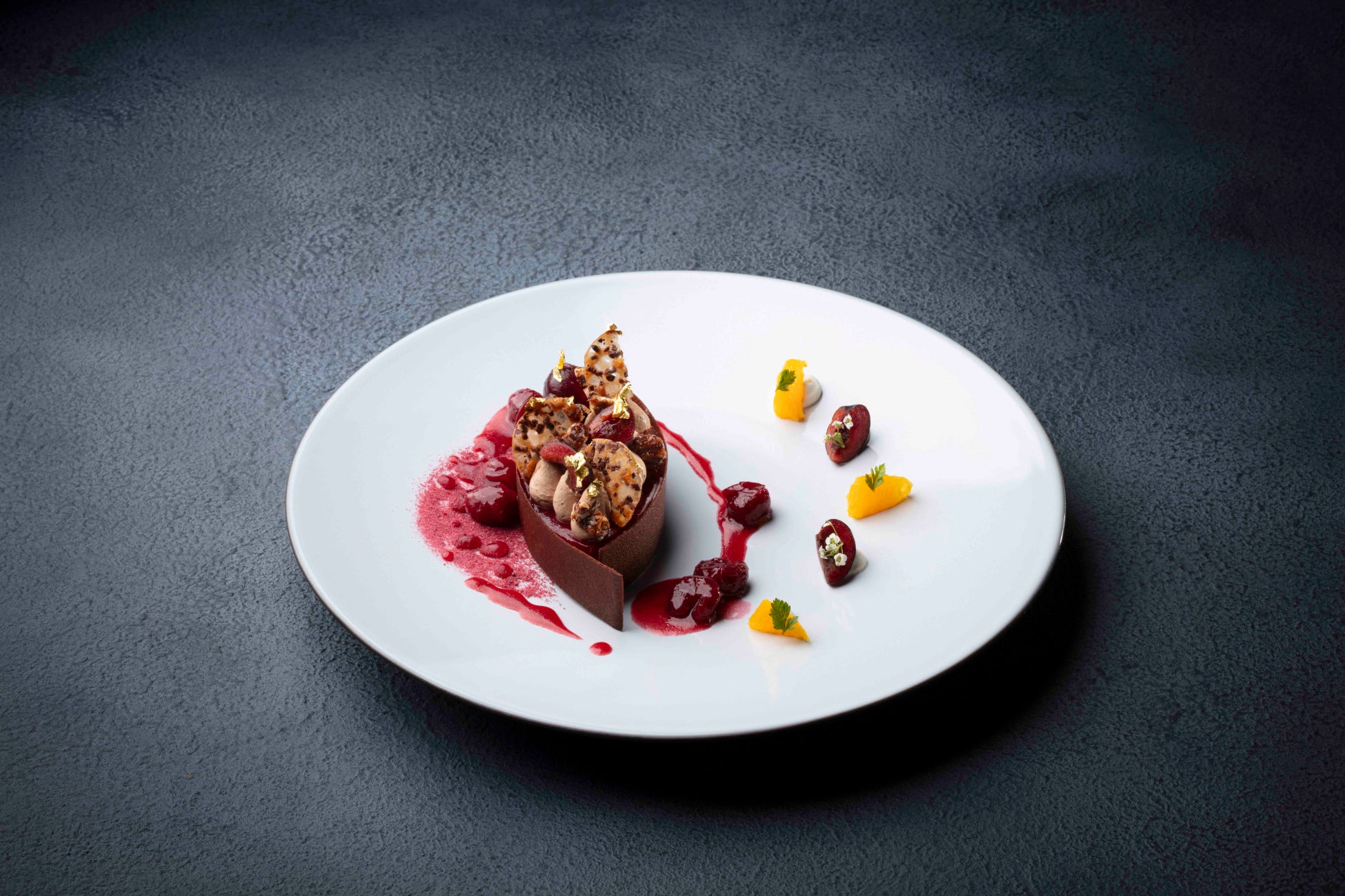 トンカビーンズとバニラのパルフェにチョコレートシャンティー、チェリーコンポートを組み合わせました。
