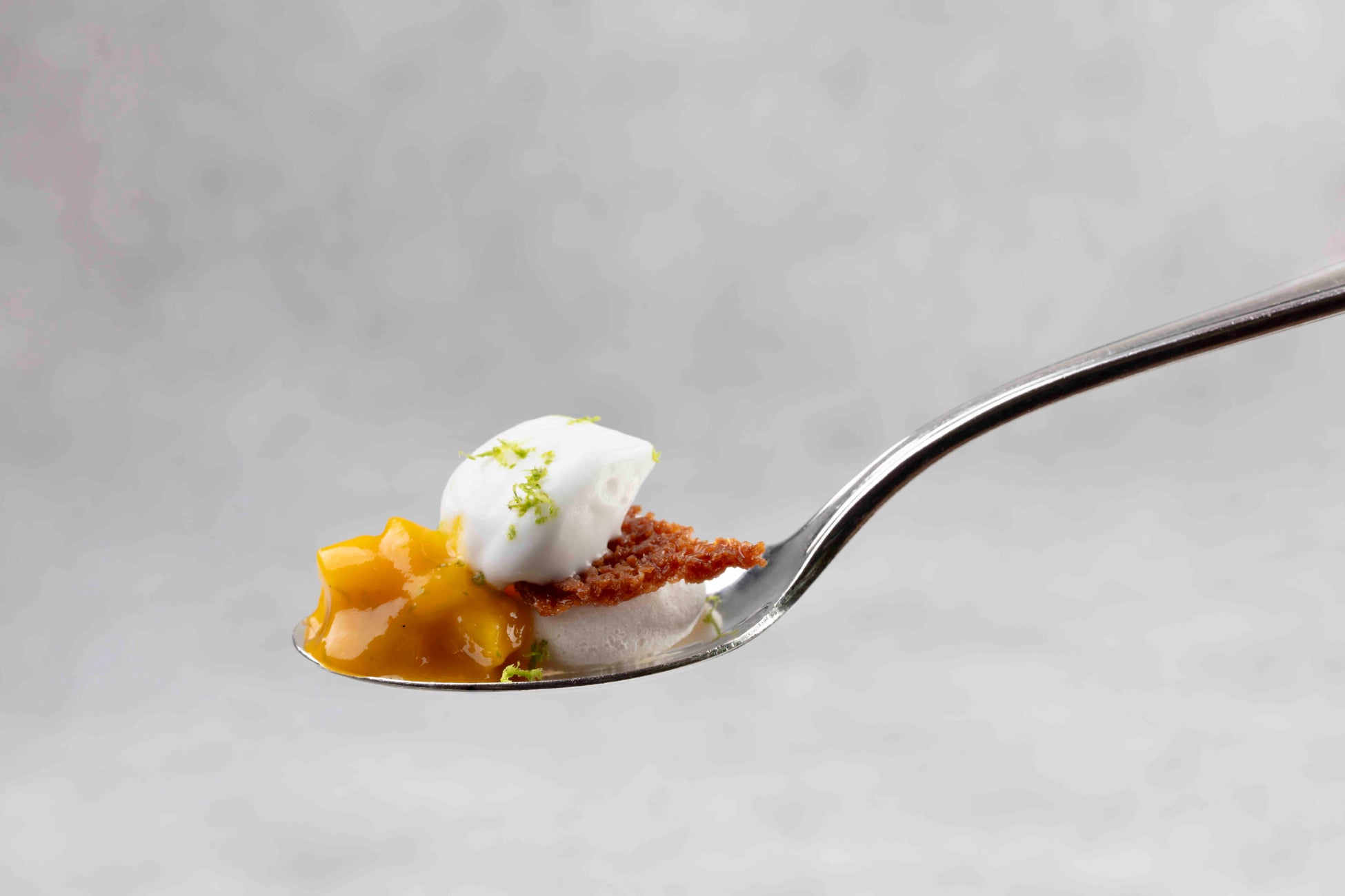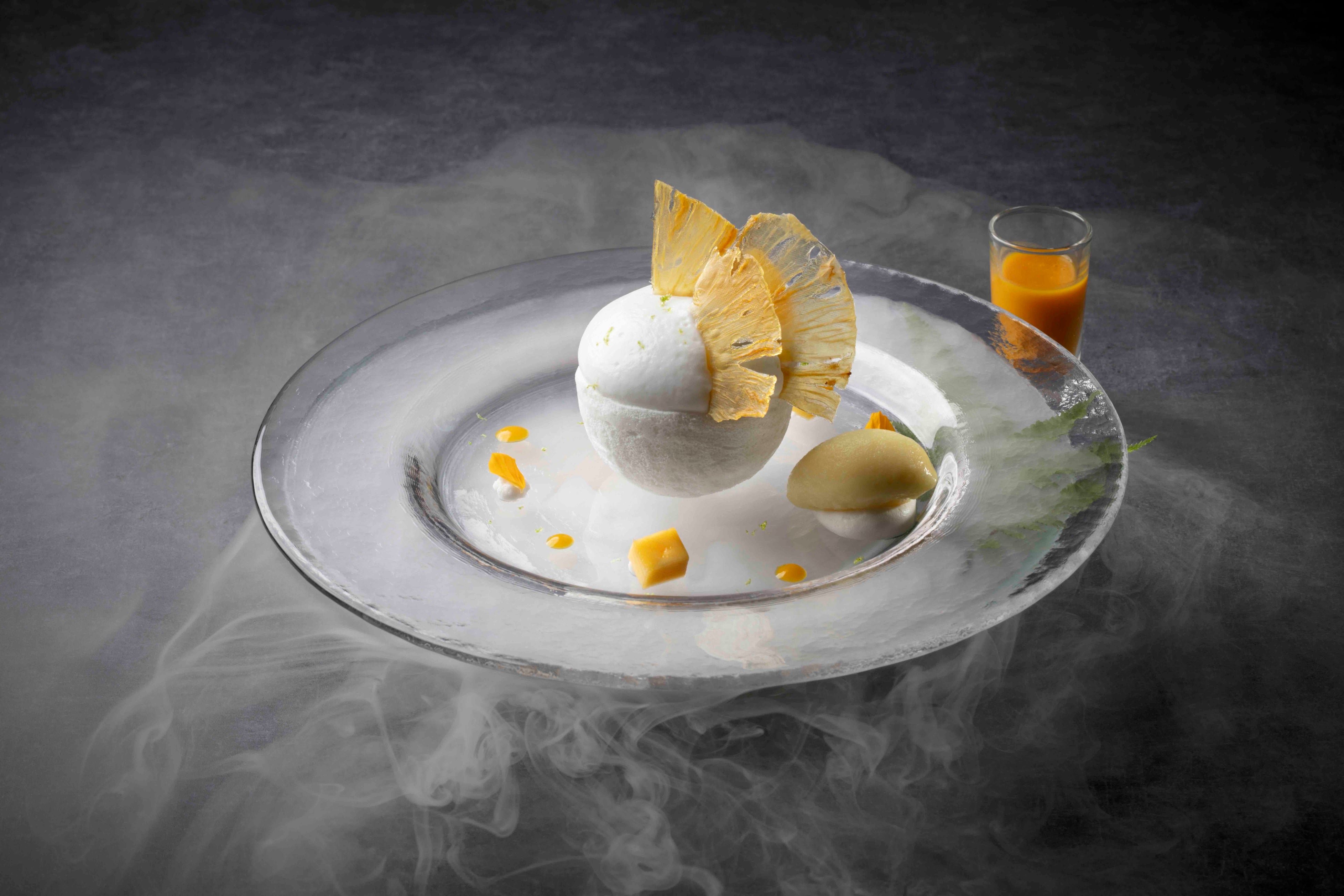 ライムのメレンゲとエキゾチックフルーツのヴァシュラン、ココナッツを色々な形で表現。