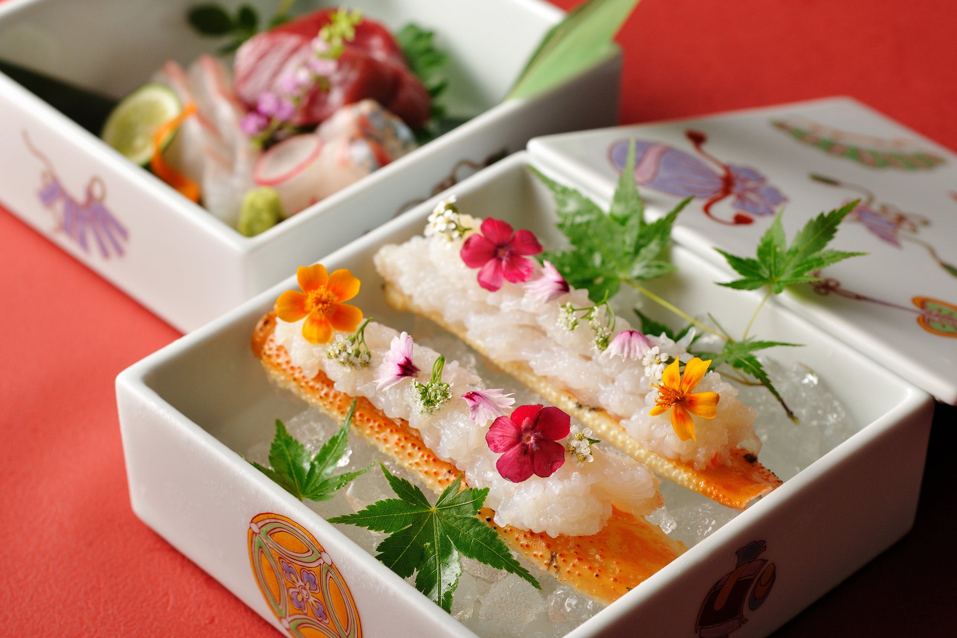 従来、温泉旅館で提供されている蟹会席は、シンプルな蟹刺しや焼き蟹から始まり、メインで丸ごと一杯の蟹を蟹酢で味わうなど、蟹本来の味を堪能するのが大きな魅力ですが、界 出雲では見た目にも新しさのある料理を目指しました。お造りで用意するのは「松葉蟹 湯引き刺し」。開運をモチーフにした華やかな器に、湯引きをして甘みを際立たせ、丁寧に剥いた蟹刺しが並びます。エディブルフラワーを添え見た目にも華やかな一品で、飽きることなく蟹を楽しむことができます。