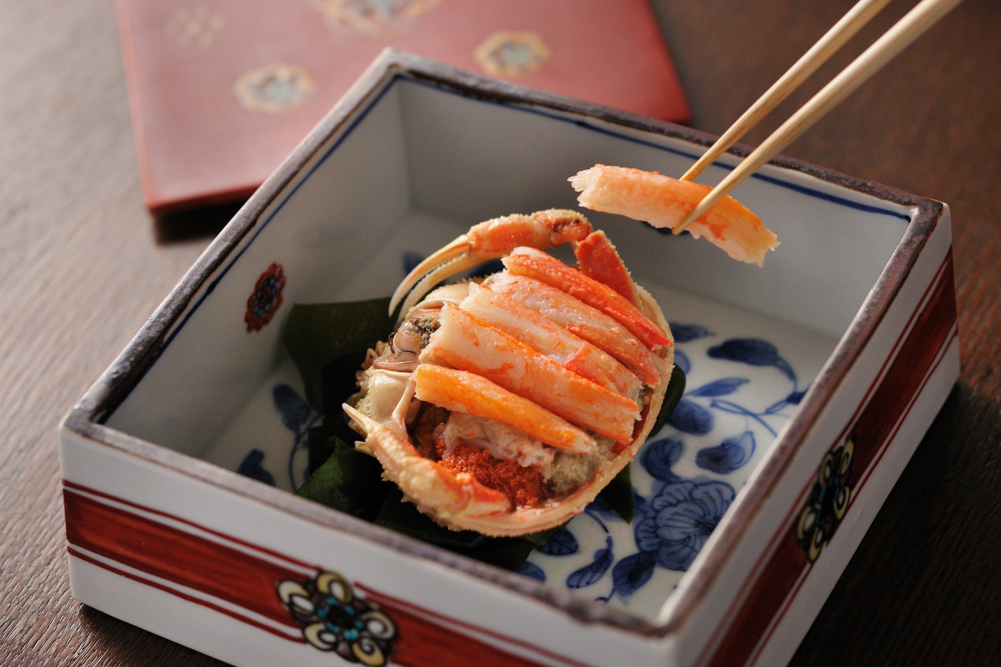 「器は料理の着物」と唱えた美食家「北大路魯山人」は、界 加賀にもゆかりのある人物です。その教えにならい、界 加賀ではそれぞれの料理に合わせる器にもこだわり、地元の九谷焼作家の方々が制作したオリジナルのものも多くそろえています。卵や味噌を楽しむメスのズワイガニ、香箱蟹(こうばこがに)は、九谷焼の窯元「萌窯(もえがま)」が作陶した小箱に入れて提供します。鮮やかな赤い蓋を開けると、「染付(そめつけ)」と呼ばれる技法で描かれた藍色の模様が顔を出し、蟹との色のコントラストを楽しめます。器をじっくりと愛でられるのもひとりの醍醐味です。
