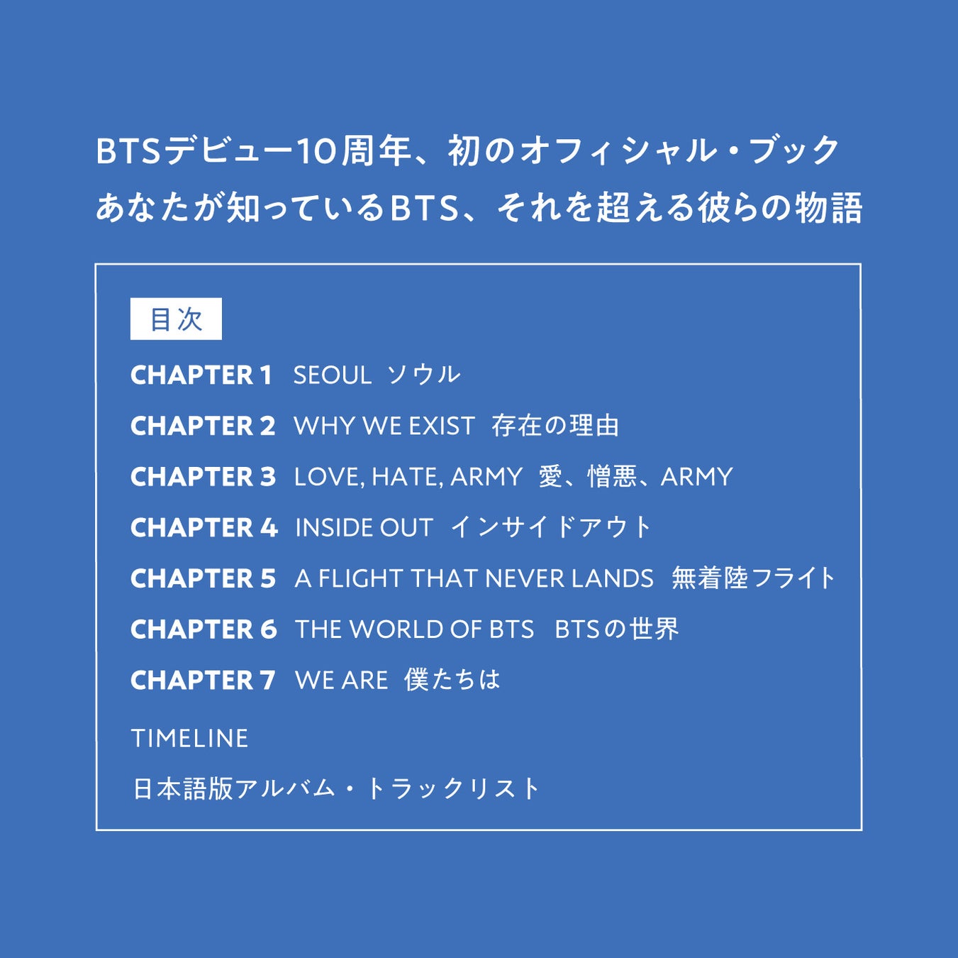 あなたが知っているBTS、それを超える彼らの物語。共にしてきた‶花樣年華〟、青春の最初の記録――。3年以上にわたる深層取材、そしてRM、SUGA、JIN、J-HOPE、JIMIN、V、JUNG KOOKの7人がインタビューを通して聞かせてくれるグループの軌跡とビハインド・ストーリー。アーティストとして、また個人としてのBTSの素顔とまなざしを収めた未公開ポートレート21枚を掲載。