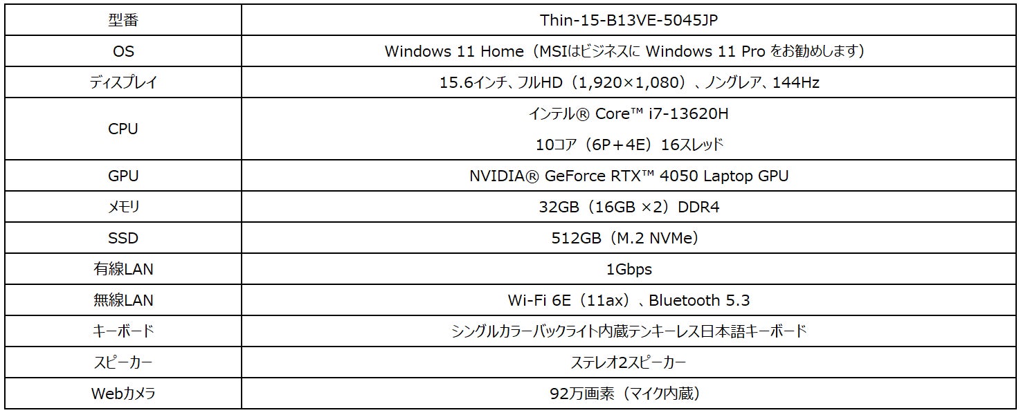 ・Thin 15 B13V シリーズ製品ページ:https://jp.msi.com/Laptop/Thin-15-B13VX