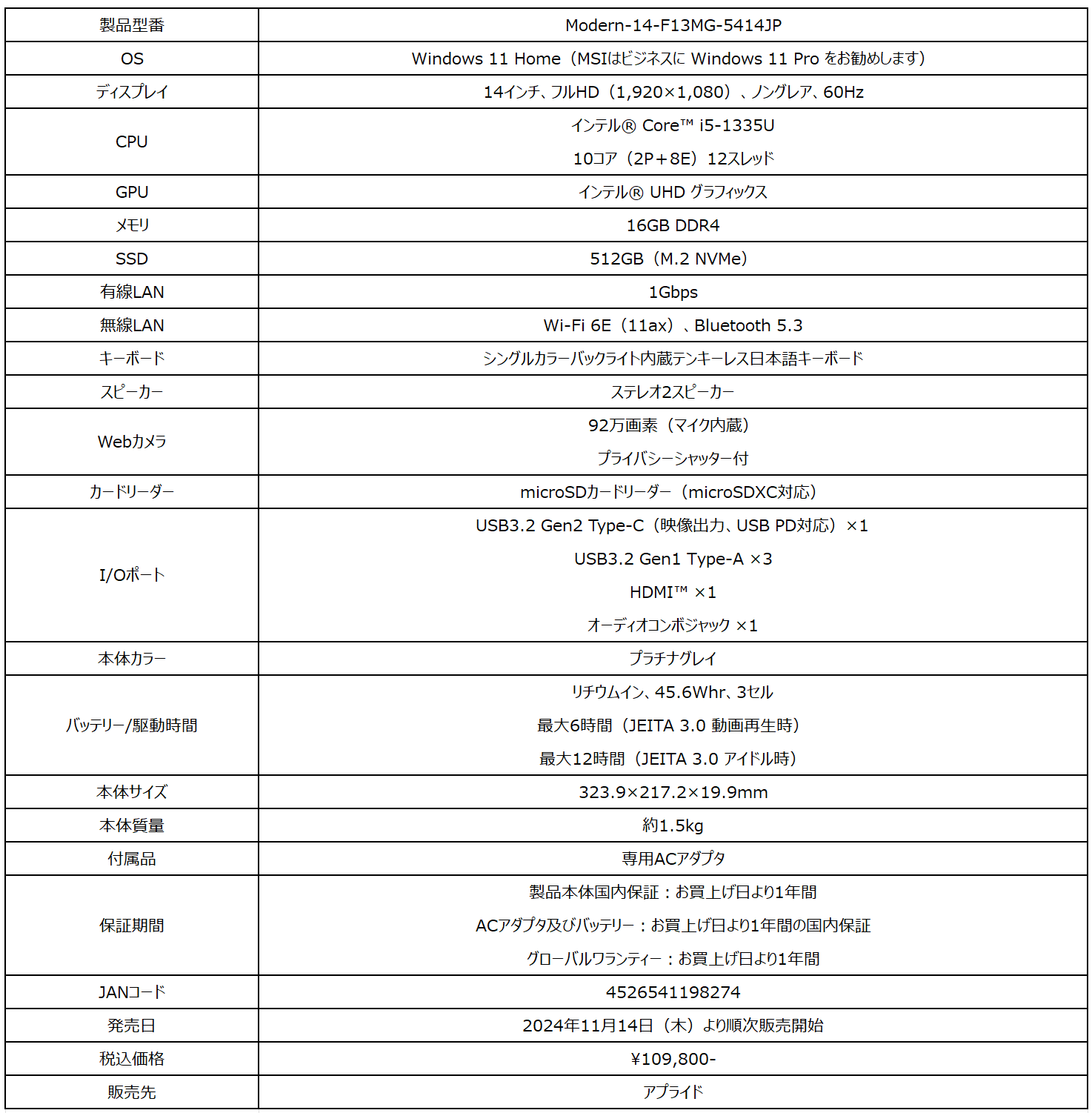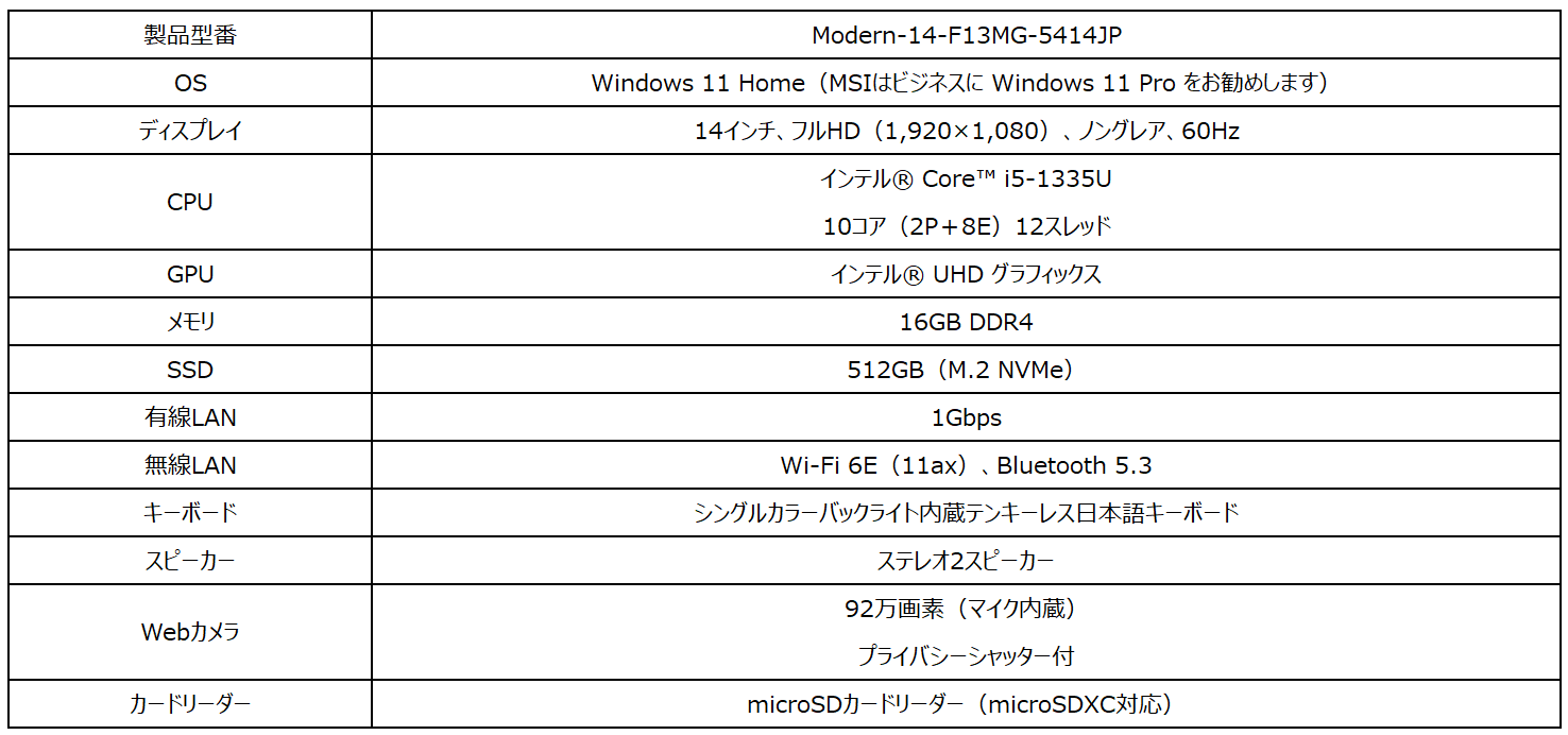 ・Modern 14 F13M 製品ページ:https://www.msi.com/Business-Productivity/Modern-14-F13MX