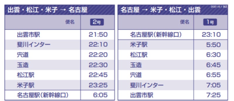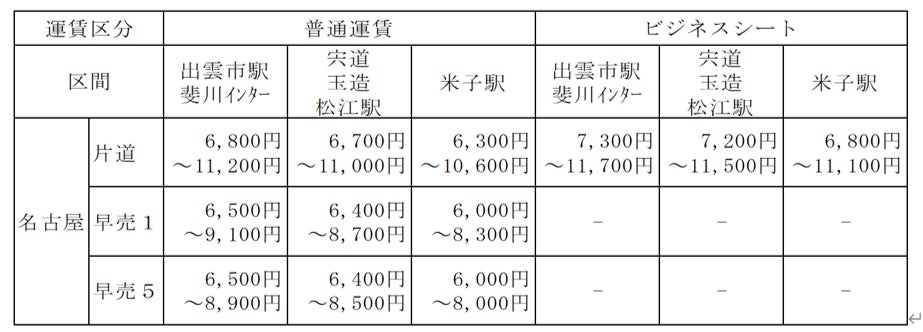 中国ジェイアールバス スワロートラベル出雲店、JR東海バス 名古屋旅行センター、一畑トラベ