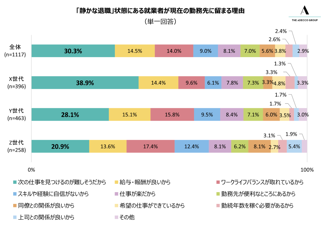 続いて、「静かな退職」状態にあるものの、現在の勤務先での仕事を続ける考えを持っていたX・Y・Z世代の就業者1,117人に対し、「現在の勤務先での仕事を続ける理由は何ですか?」と質問したところ、もっとも多く挙げられた理由は、「次の仕事を見つけるのが難しそうだから」(30.3%)でした。