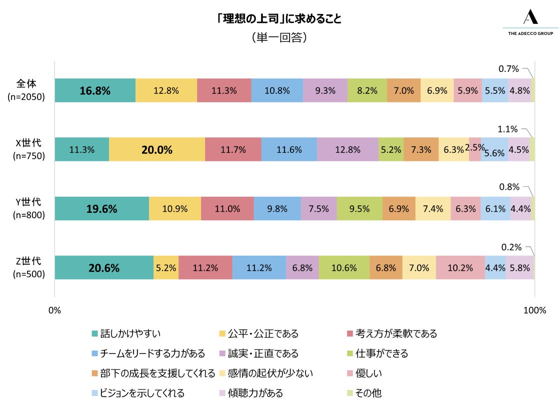 続いて、「あなたが『理想の上司』に求めることは何ですか?」と質問したところ、求めることとしてもっとも多く挙げられたのは、「話しかけやすい」(16.8%)でした。「話しかけやすい」は、Z世代とY世代でもっとも求めることのトップになりました。一方、X世代では、「公平・公正である」がトップでした。