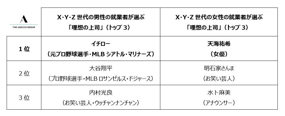 男性の就業者が選ぶ「理想の上司」は「イチロー」、女性の就業者が選ぶ「理想の上司」は「天海祐希」でした。イチローさんと天海祐希さんは、男女ともにすべての世代の就業者が「理想の上司」のトップに選びました。