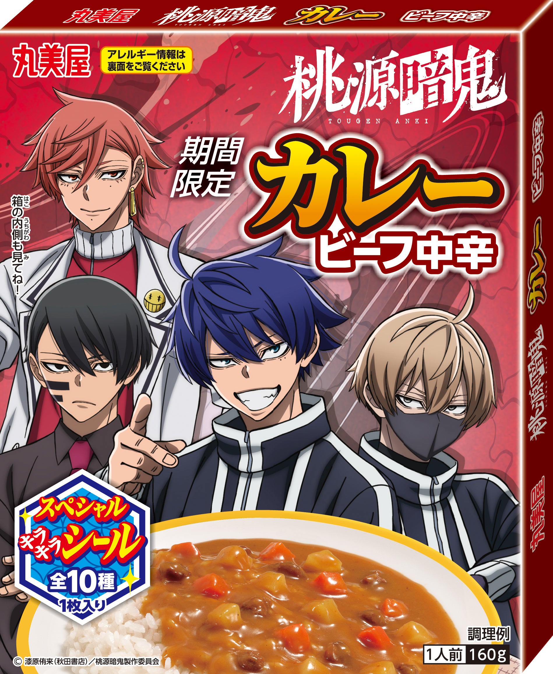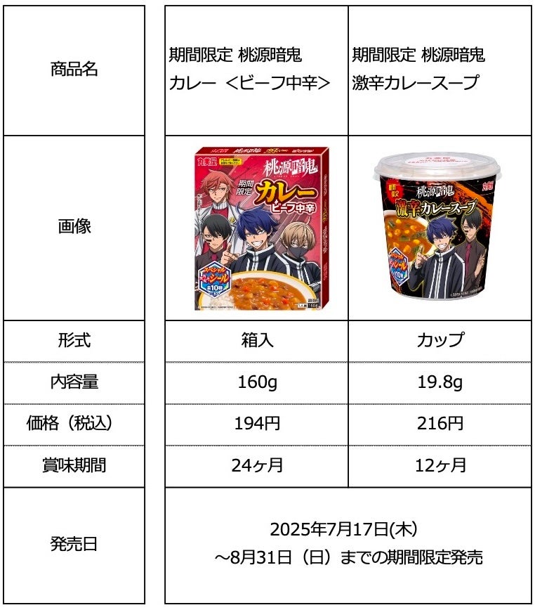 丸美屋食品工業株式会社(本社:東京都杉並区、社長:阿部豊太郎)は、TVアニメ「桃源暗鬼」を採用した「期間限定 桃源暗鬼カレー<ビーフ中辛>」 「期間限定 桃源暗鬼激辛カレースープ」を2025年7月17日(木)から8月31日(日)までの期間限定で発売いたします。