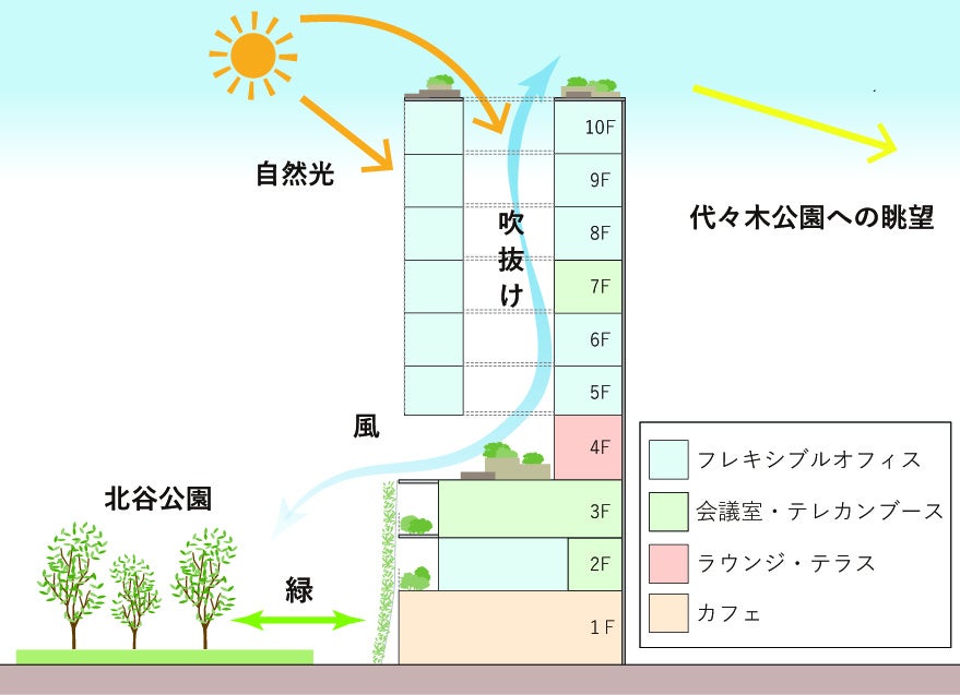本物件の1階はサンドイッチカフェ、2~10階はフレキシブルオフィスと北谷公園を感じられるラウンジ、北谷公園に加え代々木公園も見渡すことのできる屋上、Web会議の増加に対応するテレカンブース(18室)、社内外とのリアルなコミュニケーションの場となる会議室(6室)など、ワーカーのその日の気分や仕事内容に合わせて「好きに、働く。」ための共用空間を設けています。なお、フレキシブルオフィスは、1名用から19名用まで多様な大きさの専有区画(3~40㎡)を用意し、あらかじめデスク・チェアーが設置されているセットアップオフィスとなり、外壁ガラス面および建物中心の吹き抜けから差し込む自然光や風により、一般的なフレキシブルオフィスでは得がたい開放性を有した空間となっています。